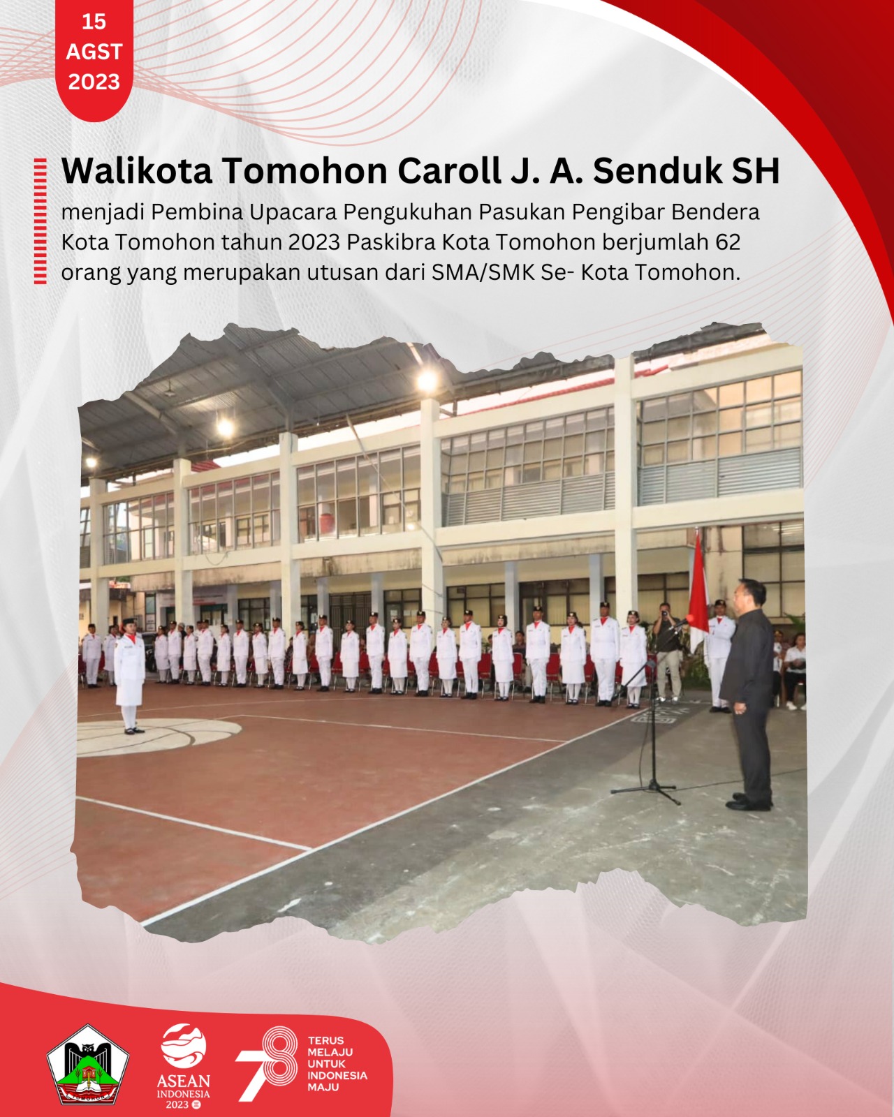 TOMOHON,Global Berita —-Walikota Tomohon Caroll Joram Azarias Senduk, S.H. menjadi Pembina Upacara Pengukuhan Pasukan Pengibar Bendera Kota Tomohon tahun 2023 Paskibra Kota Tomohon berjumlah 62 orang yang merupakan utusan dari SMA/SMK Se- Kota Tomohon. Anugerah hall Kota Tomohon Selasa,(15/8/2023).