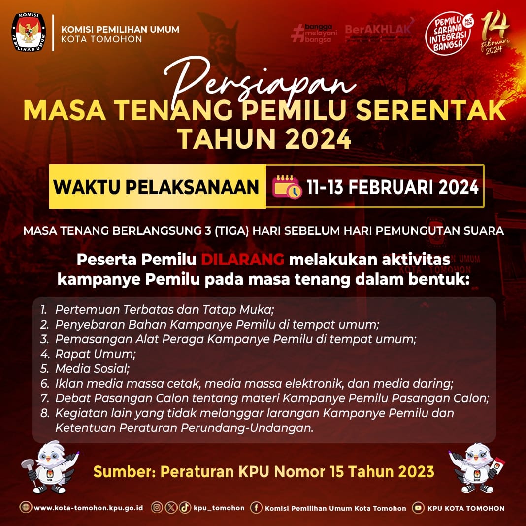 Dengan begitu, peserta pemilu dilarang melaksanakan kampanye pemilu dalam bentuk apa pun selama masa tenang dari tanggal 11-13 Februari.