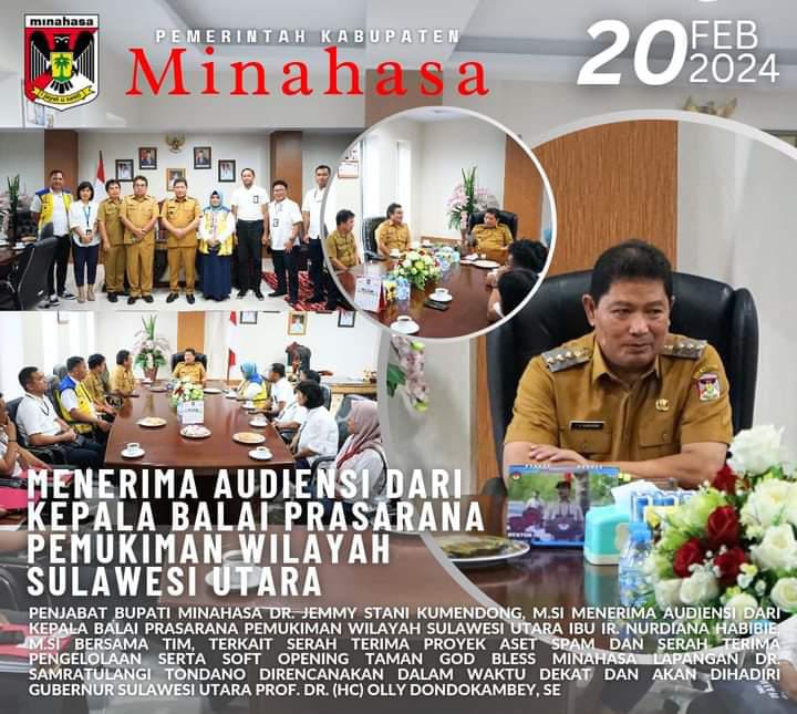 GLOBAL BERITA, MINAHASA -Pj Bupati Minahasa Dr. Jemmy Stani Kumendong M.Si, menerima audiensi dari Kepala Balai Prasarana dan Pemukiman Wilayah Sulut, Ir. Nurdiana Habibie M.Si bersama tim bertempat di ruang kerja Bupati, Selasa (20/2/2024).