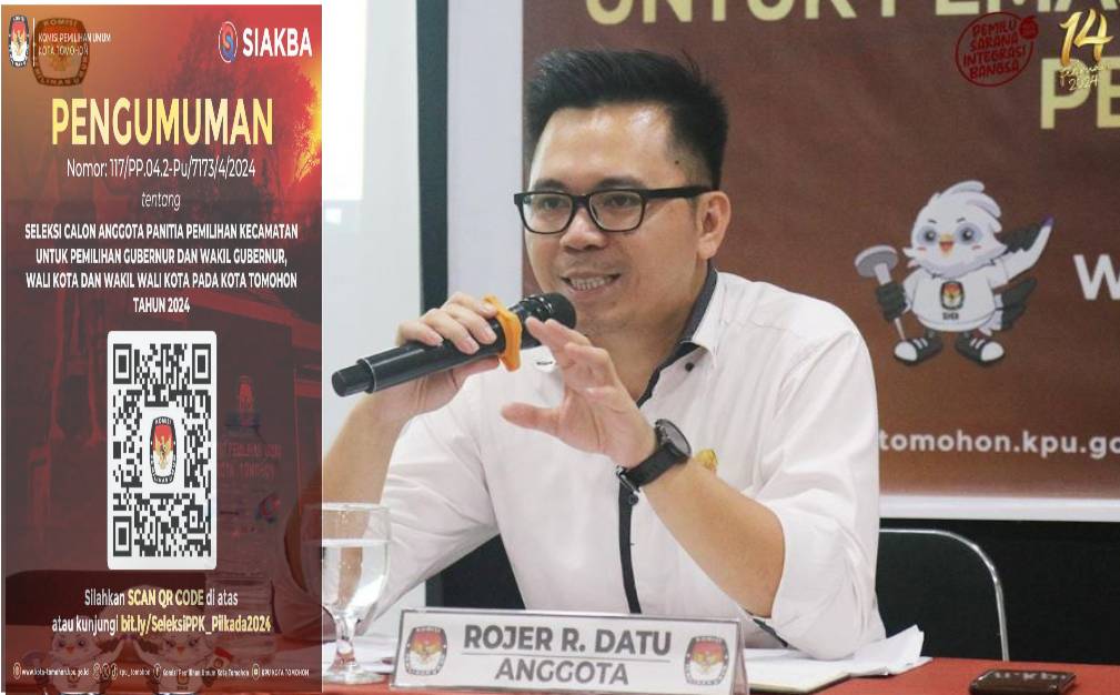 Ketua KPU Tomohon, melalui Komisioner Bidang Divisi Sosialisasi, Pendidikan Pemilih, Partisipasi Masyarakat dan SDM KPU Kota TomohonRojer R. Datu menjelaskan, proses seleksi terbuka digelar untuk menyambut Pilkada Serentak 2024 Pemilihan Gubernur/Wakil Gubernur Sulawesi Utara dan Wali Kota/Wakil Wali Kota Tomohon mendatang.