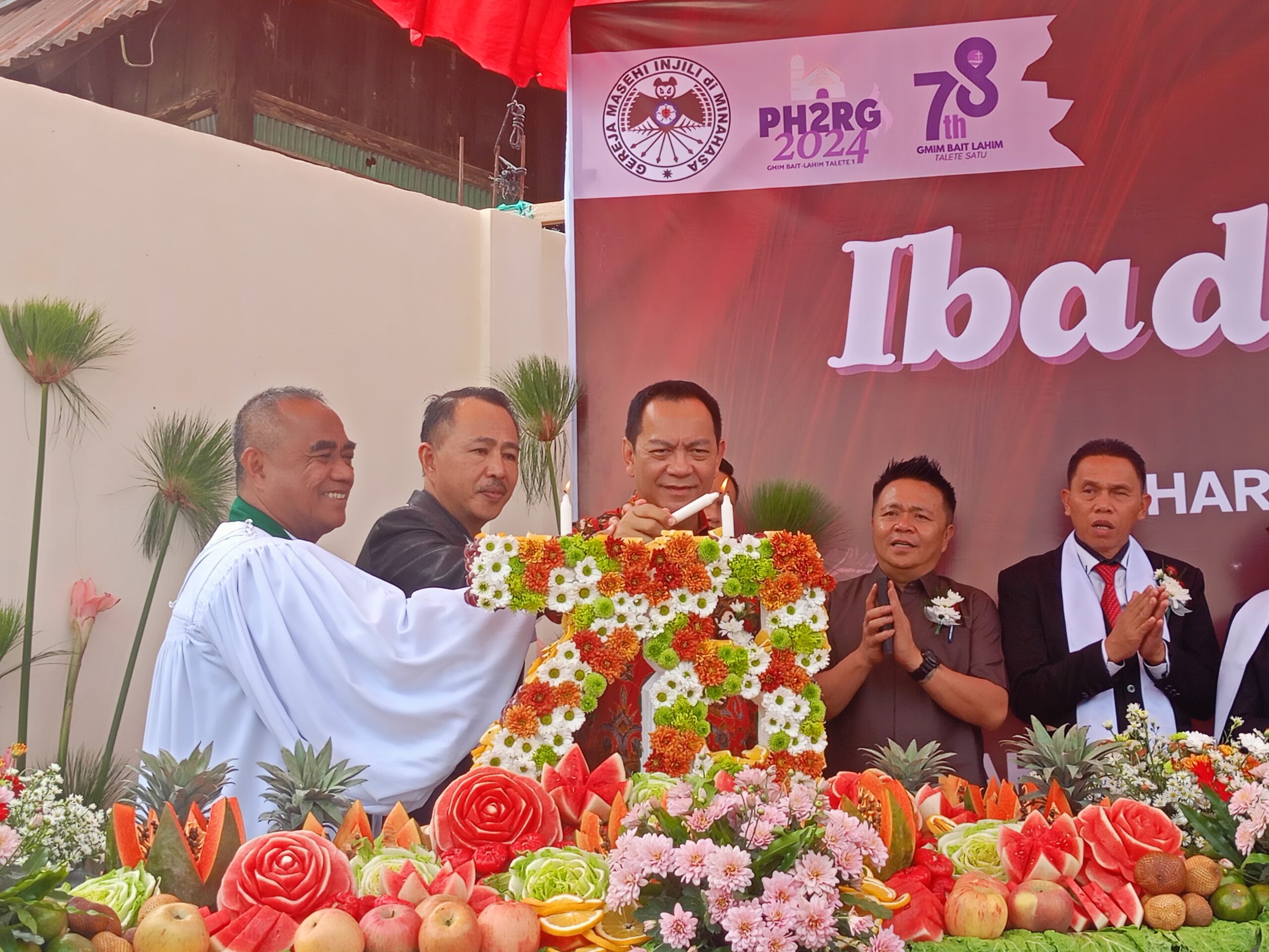 TOMOHON, GLOBAL BERITA — Walikota Tomohon Carol Joram Azarias Senduk SH menghadiri Ibadah Syukur Hari ulang Tahun ke – 78 Jemaat GMIM “Bait – Lahim” Talete Satu Wilayah Tomohon Sentrum dirangkaikan dengan Pentahbisan / Peresmian Pastori Empat dan Penggunaan Taman Kanak-kanak Bait – Lahim Talete Satu. Minggu, (21/7/2024).