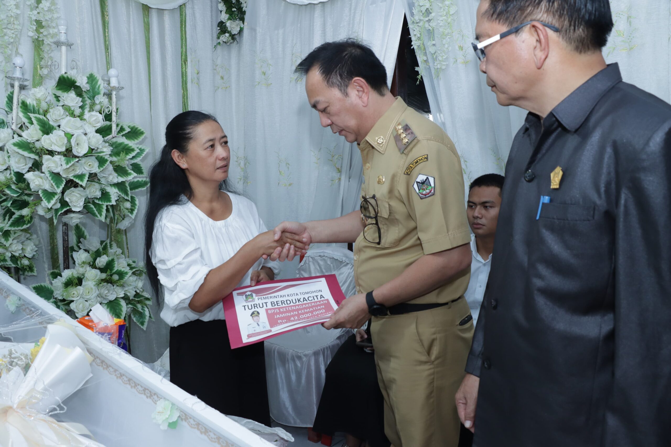 Pada kesempatan ini Walikota menyerahkan langsung santunan Duka dan akte kematian kepada keluarga yang berduka dengan harapan dapat membantu dan boleh menjadi kekuatan bagi keluarga yang berduka.