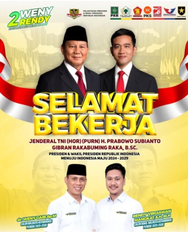 Kotamobagu,Globalberita.com-Sejak di Lantiknya Presiden RI, Pasangan Calon Wali Kota dan Wakil Wali Kota Kotamobagu Nomor Urut 2, Dokter Weny Gaib dan Rendy Mangkat, yang dikenal dengan sebutan “The Winner,” secara resmi mengucapkan selamat atas pelantikan Presiden dan Wakil Presiden Republik Indonesia, Prabowo Subianto dan Gibran Rakabuming Raka, yang berlangsung pada 20 Oktober 2024.