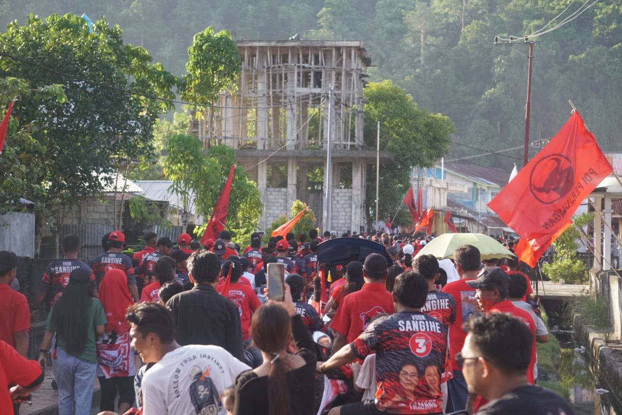 SANGIHE, GLOBALBERITA – Ribuan massa dari berbagai kampung yang ada di Kecamatan Tabukan Utara ‘merahkan’ Lapangan Petta, Rabu (30/10/2024) sore, lokasi kampanye terbuka pasangan yang diusung PDI Perjuangan di Pilkada Sangihe 2024, dr Rinny Tamuntuan-Mario Seliang SE.
