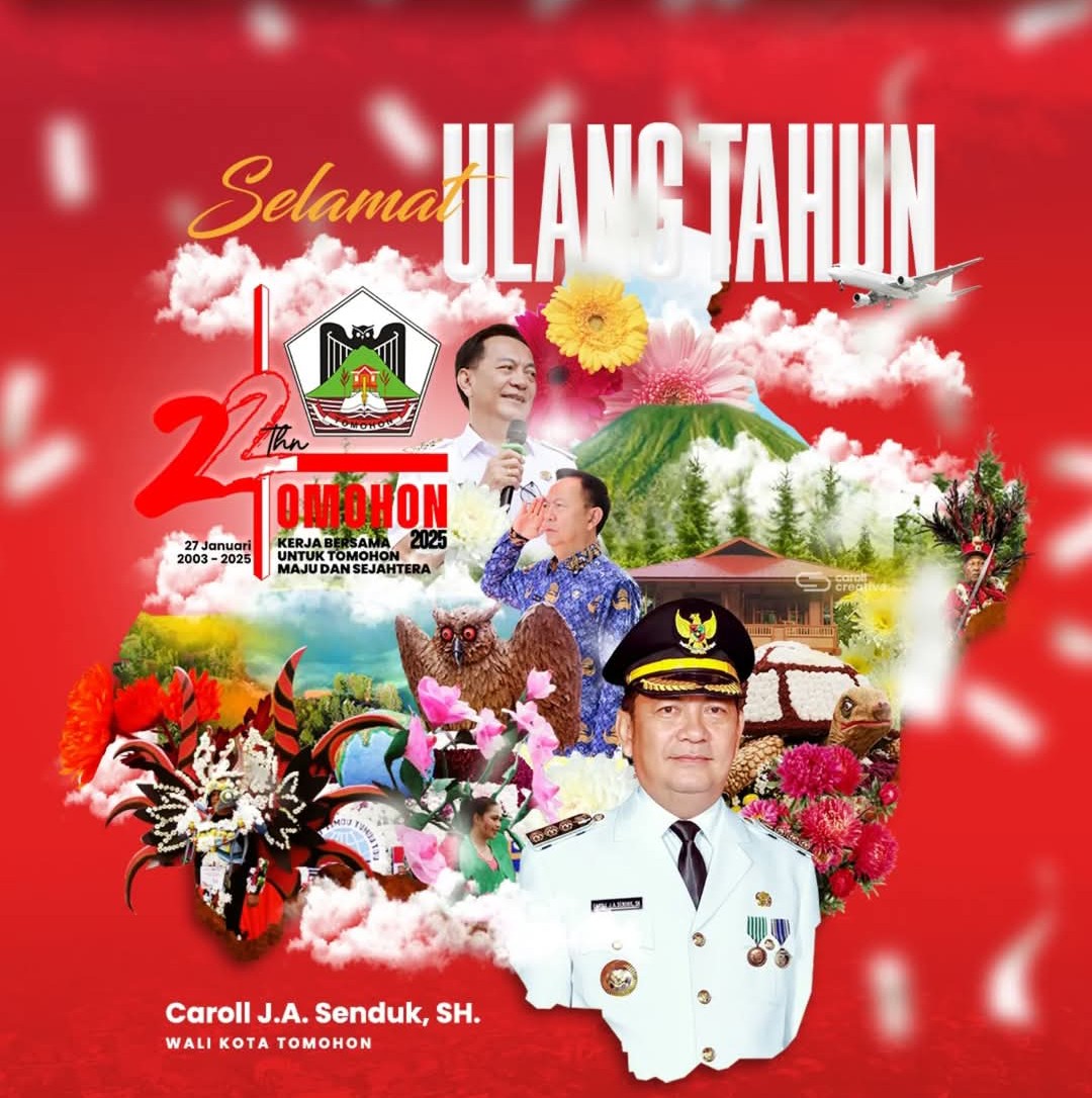GLOBAL BERITA, TOMOHON — Wali Kota Caroll Joram Azarias Senduk, SH menyampaikan ucapan selamat Hari Ulang Tahun Ke-22 Kota Tomohon yang tepat jatuh hari ini, Senin 27 Januari 2025.