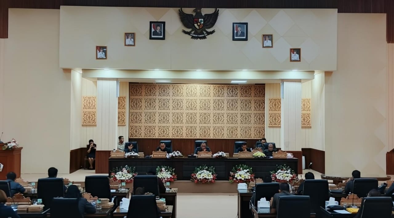 GLOBAL BERITA, TOMOHON — Wali Kota Tomohon, Caroll Senduk, SH, bersama Wakil Wali Kota Sendy Rumajar, SE, M.I.Kom, menghadiri Rapat Paripurna DPRD Kota Tomohon dalam rangka penyampaian penjelasan mengenai Rancangan Peraturan Daerah (Ranperda) tentang Pertanggungjawaban Pelaksanaan APBD Tahun Anggaran 2024. Rapat yang digelar di ruang sidang DPRD Kota Tomohon ini dipimpin langsung oleh Ketua DPRD Ferdinand Turang, S.Sos, didampingi Wakil Ketua Jeffri Polii, S.Ik. dan Donald Pondaag.