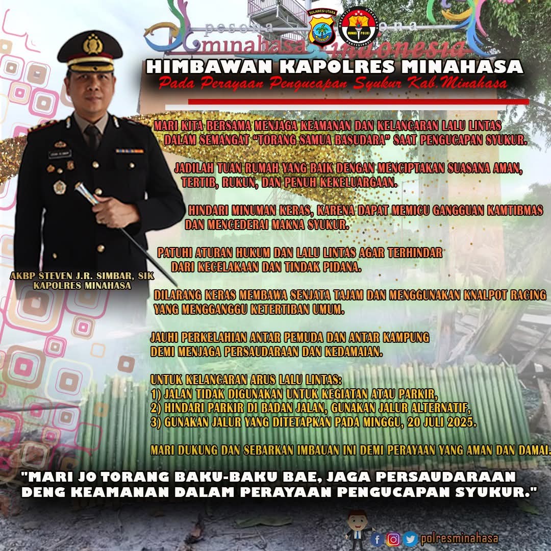 Global Berita, Minahasa — Dalam rangka menjaga keamanan dan ketertiban selama perayaan Pengucapan Syukur di Kabupaten Minahasa, Kapolres Minahasa, AKBP Steven J.R. Simbar, SIK, mengeluarkan himbauan kepada masyarakat. Himbauan ini bertujuan untuk menciptakan suasana aman, tertib, rukun, dan penuh kekeluargaan selama perayaan.