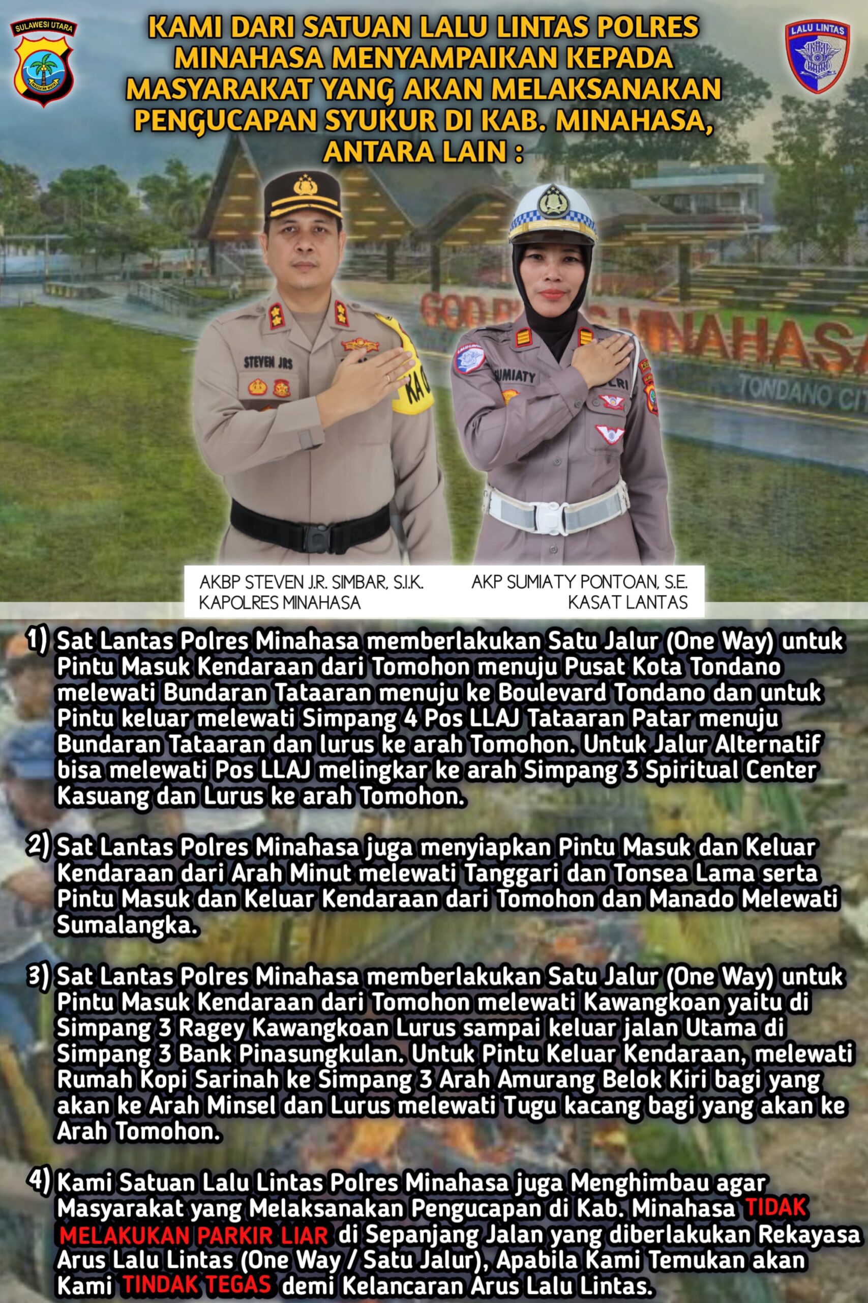 Global Berita, Minahasa — Polres Minahasa memberlakukan rekayasa arus lalu lintas selama Pengucapan Syukur di Kabupaten Minahasa. Berikut adalah rincian rekayasa lalu lintas yang diterapkan: