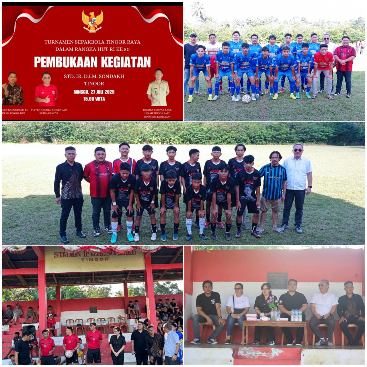 Tomohon,Global Beritaa – Dalam rangka memperingati Hari Ulang Tahun ke-80 Republik Indonesia, Turnamen Sepak Bola Kelurahan Tinoor Raya telah resmi dibuka oleh Wakil Wali Kota Tomohon. Pertandingan pertama antara Mode Pesawat vs Velo City FC berlangsung di Stadion Ir. D.I.M Sondakh, Tinoor, dengan ibadah pembukaan yang dipimpin oleh Pdt. Marko Wagey, S.Pd.