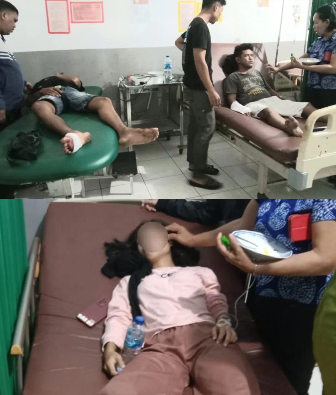 Sementara itu, pengendara Honda CBR, D.R. K, mengalami luka lecet di dagu, tangan dan kaki kanan, serta luka robek pada telapak kaki kanannya. Ketiganya segera dilarikan ke fasilitas kesehatan terdekat untuk mendapatkan perawatan, dan A .k . dirujuk ke RSUD Liun Kendage Tahuna karena luka serius.