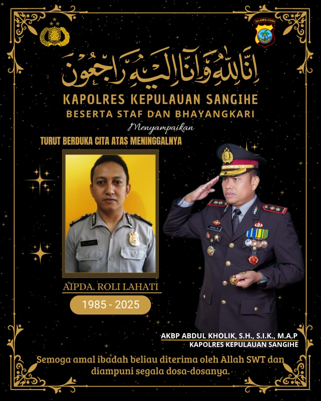 SANGIHE, GLOBALBERITA– Polres kepulauan sangihe berduka, AIPDA Roli Lahati tutup usia dikarenakan sakit, Rabu (30/7/2025).