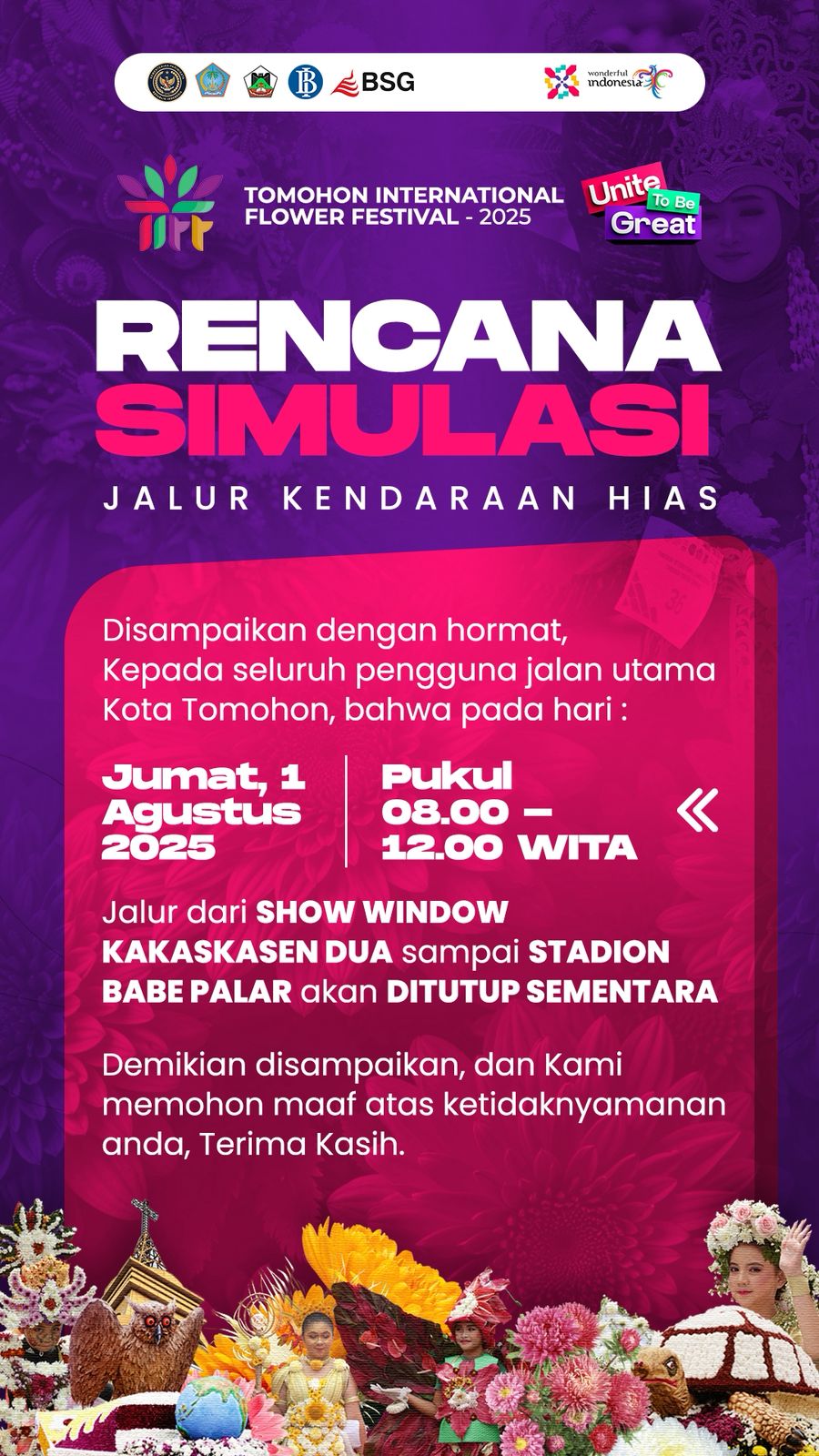 Tomohon, Global Berita – Pemerintah Kota Tomohon mengumumkan bahwa Tomohon International Flower Festival (TIFF) 2025 akan segera digelar. Dalam rangka persiapan, simulasi jalur kendaraan hias akan dilakukan pada Jumat, 1 Agustus 2025, pukul 08.00-12.00 WITA. Jalur dari Show Window Kakaskasen Dua sampai Stadion Babe Palar akan ditutup sementara selama simulasi.