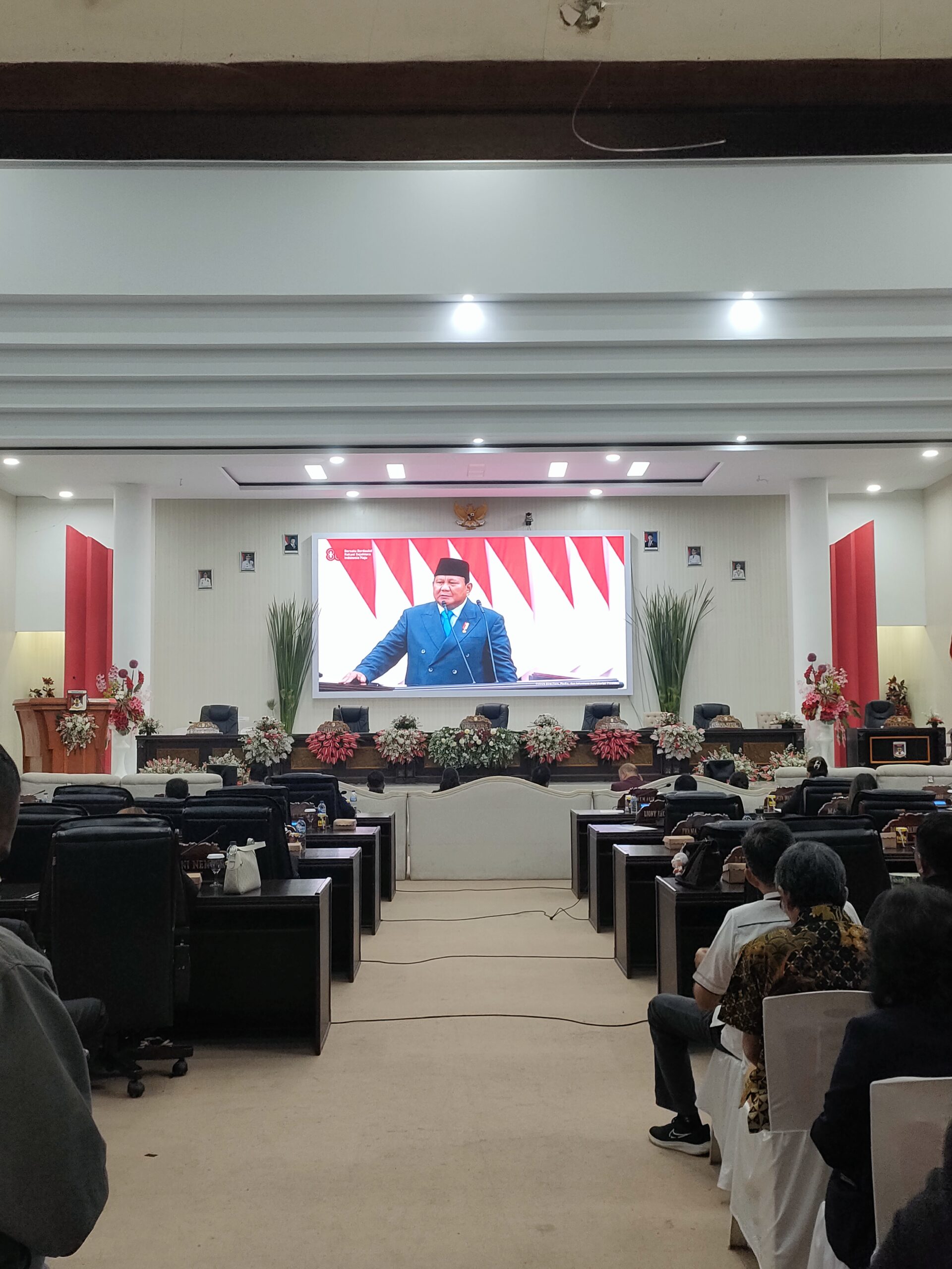 Tepat pukul 10.00 WITA, seluruh hadirin menyimak siaran langsung Sidang Tahunan MPR RI serta Sidang Bersama DPR RI dan DPD RI dari Jakarta melalui layar lebar. Dalam pidatonya, Presiden Prabowo Subianto menegaskan pentingnya keterbukaan dalam pemerintahan serta komitmen kuat memberantas korupsi.