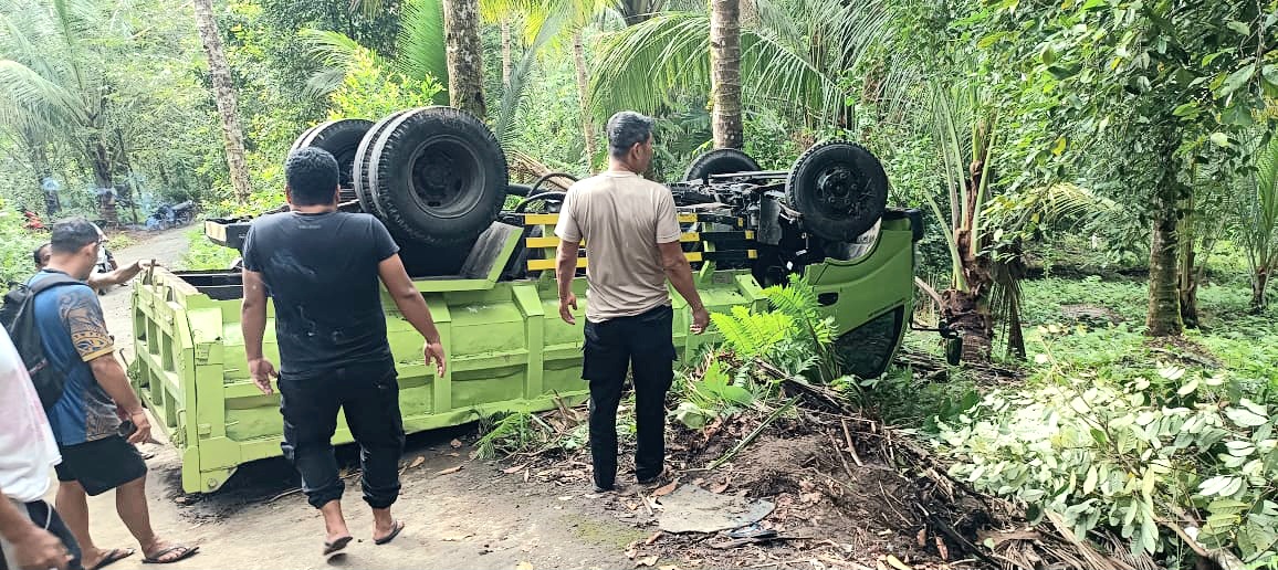 SANGIHE, GLOBALBERITA– Satu unit mobil truck alami kecelakaan di jalan produksi kampung talawid atas, kecamatan kendahe, Senin (18/8/2025).