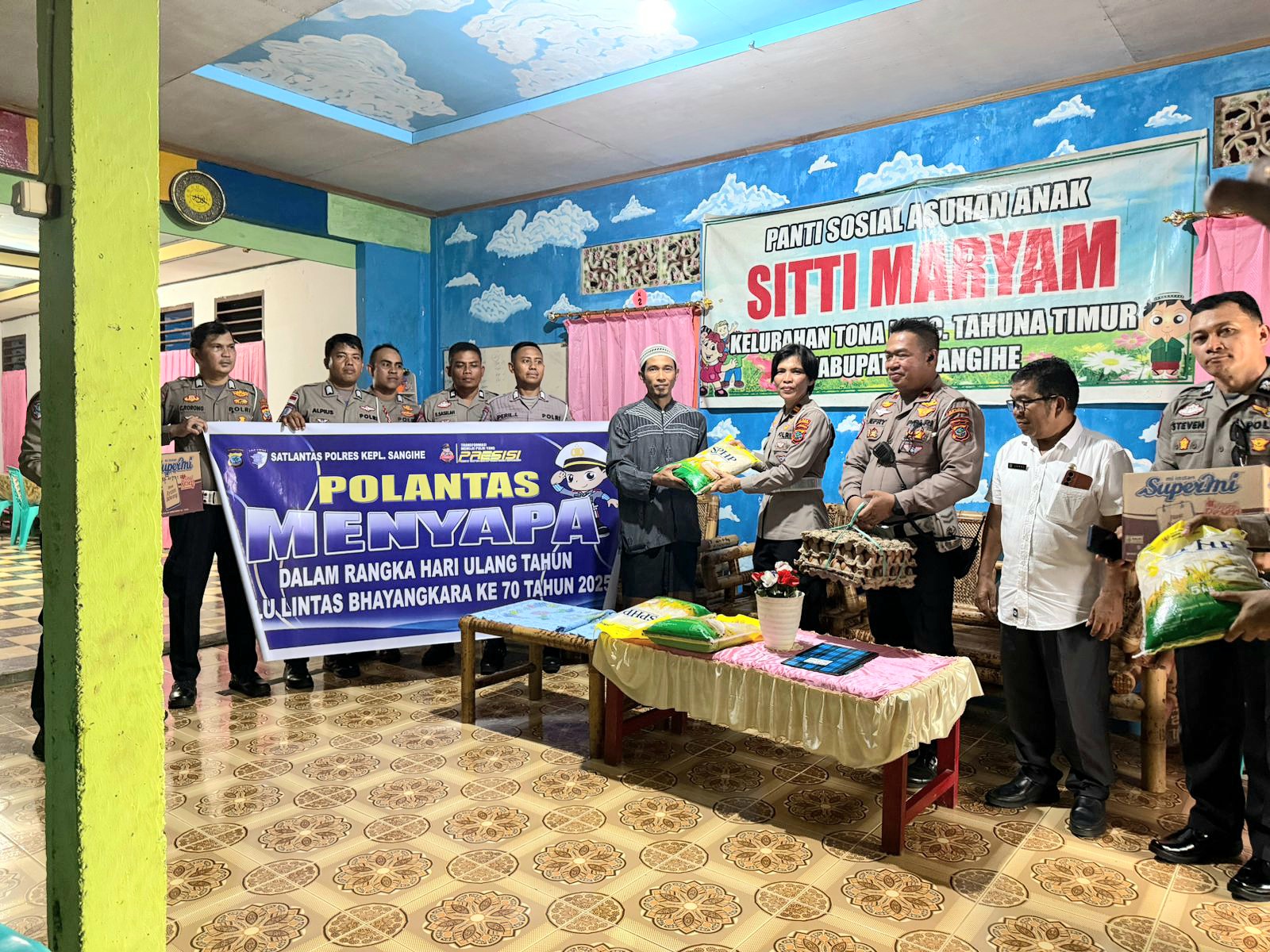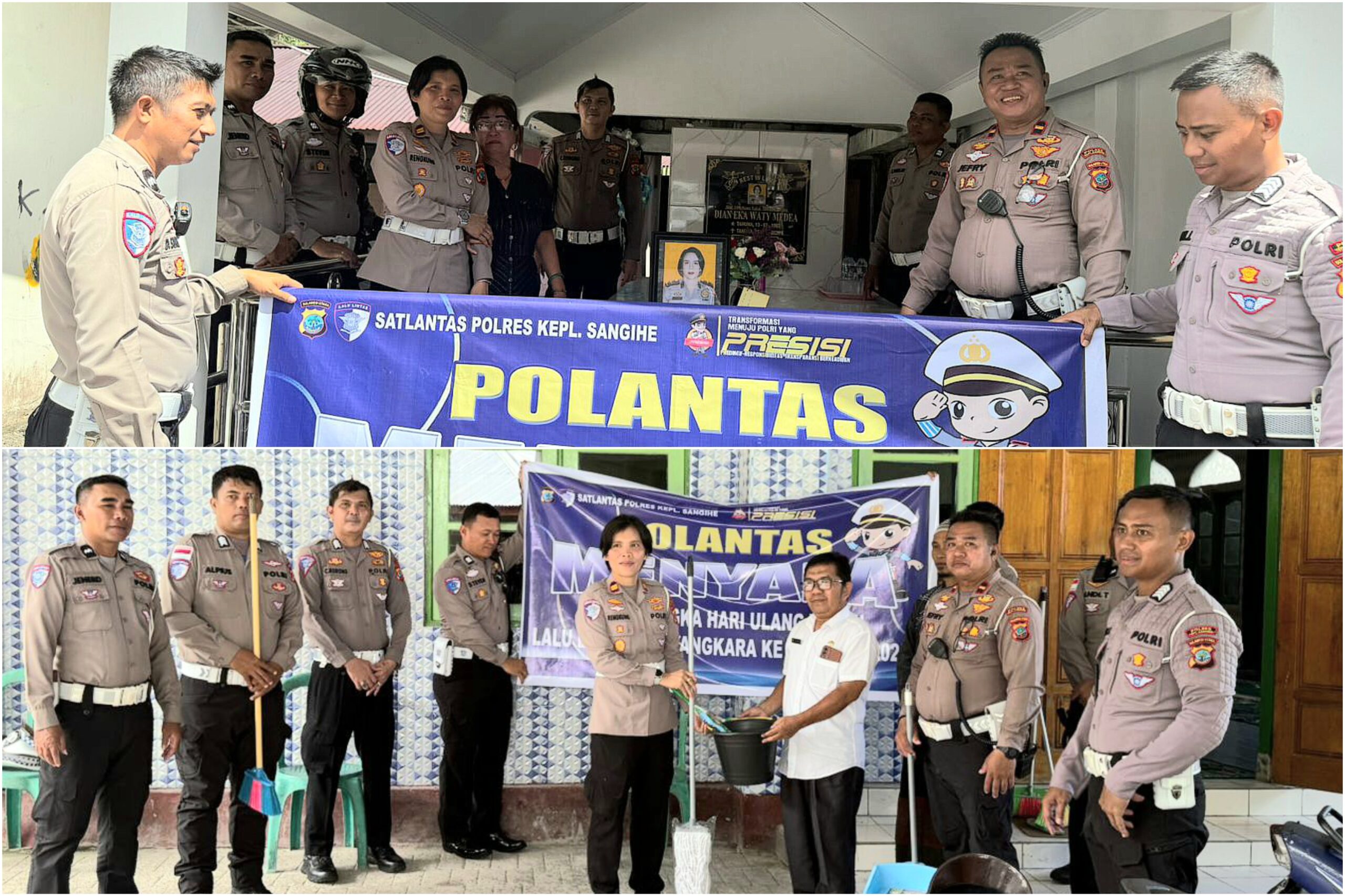 Kasatlantas Polres Kepulauan Sangihe bersama personil, menyambangi dan memberikan bantuan berupa sembako di beberapa tempat antara lain rumah-rumah ibadah dan Panti-panti Asuhan yang ada di wilayah Tahuna, yakni GKMI Bunga Bakung dan Masjid Ikhlas Beramal, Panti Asuhan Lohoraung dan Panti Asuhan Sitti Maryam serta melakukan Ziarah di makam mantan Kanit Kamsel Polres Kepulauan Sangihe almarhuma AIPTU Dian E. Medea, Rabu (10/9/2025).