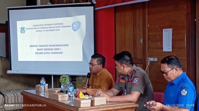 ​TOMOHON, GLOBALBERITA.COM—Satuan Pamong Praja (Satpol PP) Kota Tomohon kini diperkuat pengetahuannya dalam mekanisme penanganan tindak pidana ringan (tipiring). Hal ini terwujud dalam Lokakarya Intensif Internal Satpol PP yang menghadirkan narasumber dari kepolisian.