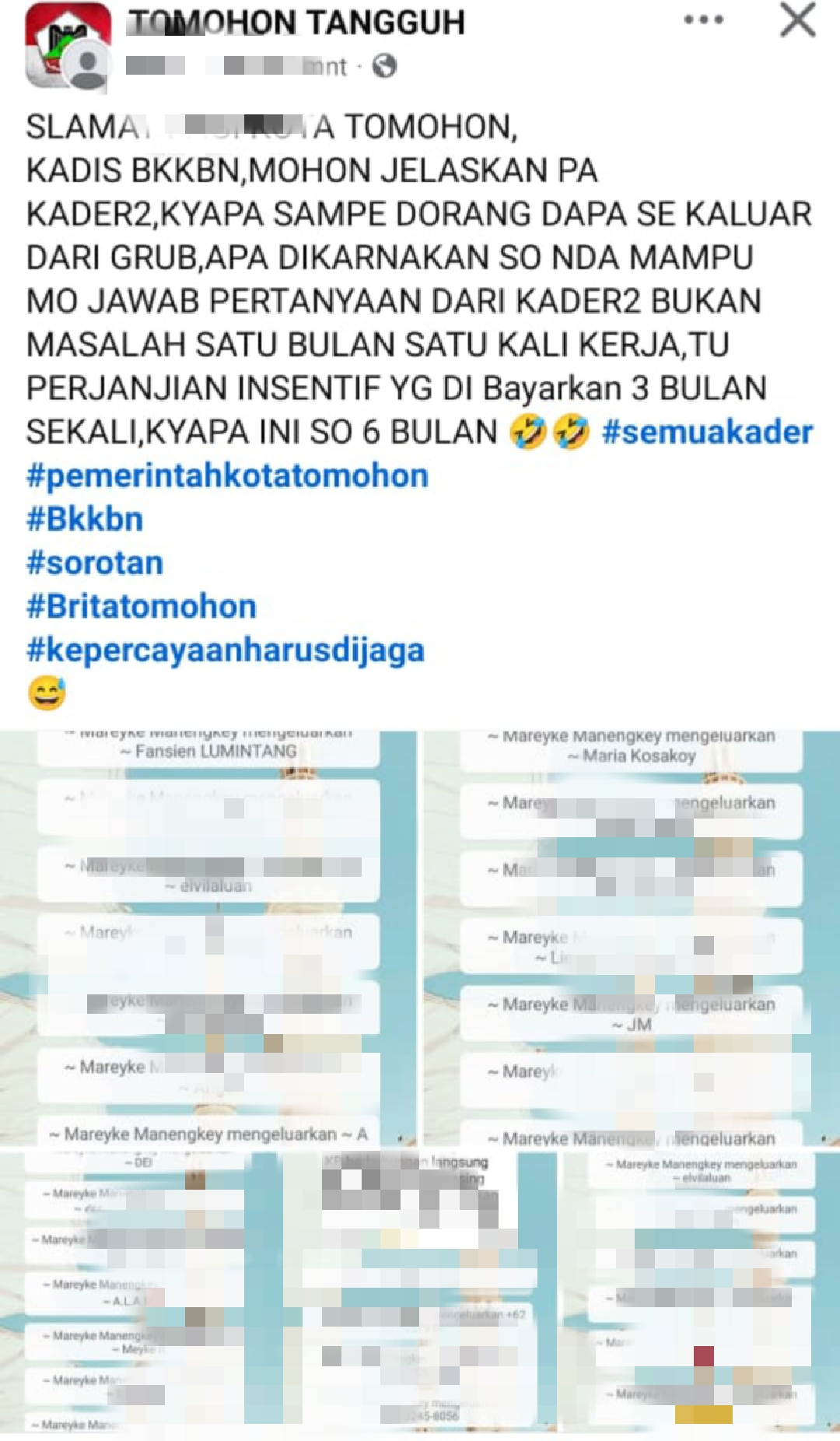 Salah seorang kader dalam sebuah postingan di medsos mengungkapkan, “Kami mempertanyakan mengapa beberapa teman dikeluarkan dari grup. Apakah karena kami sering bertanya soal insentif yang sudah lama tertunggak?”