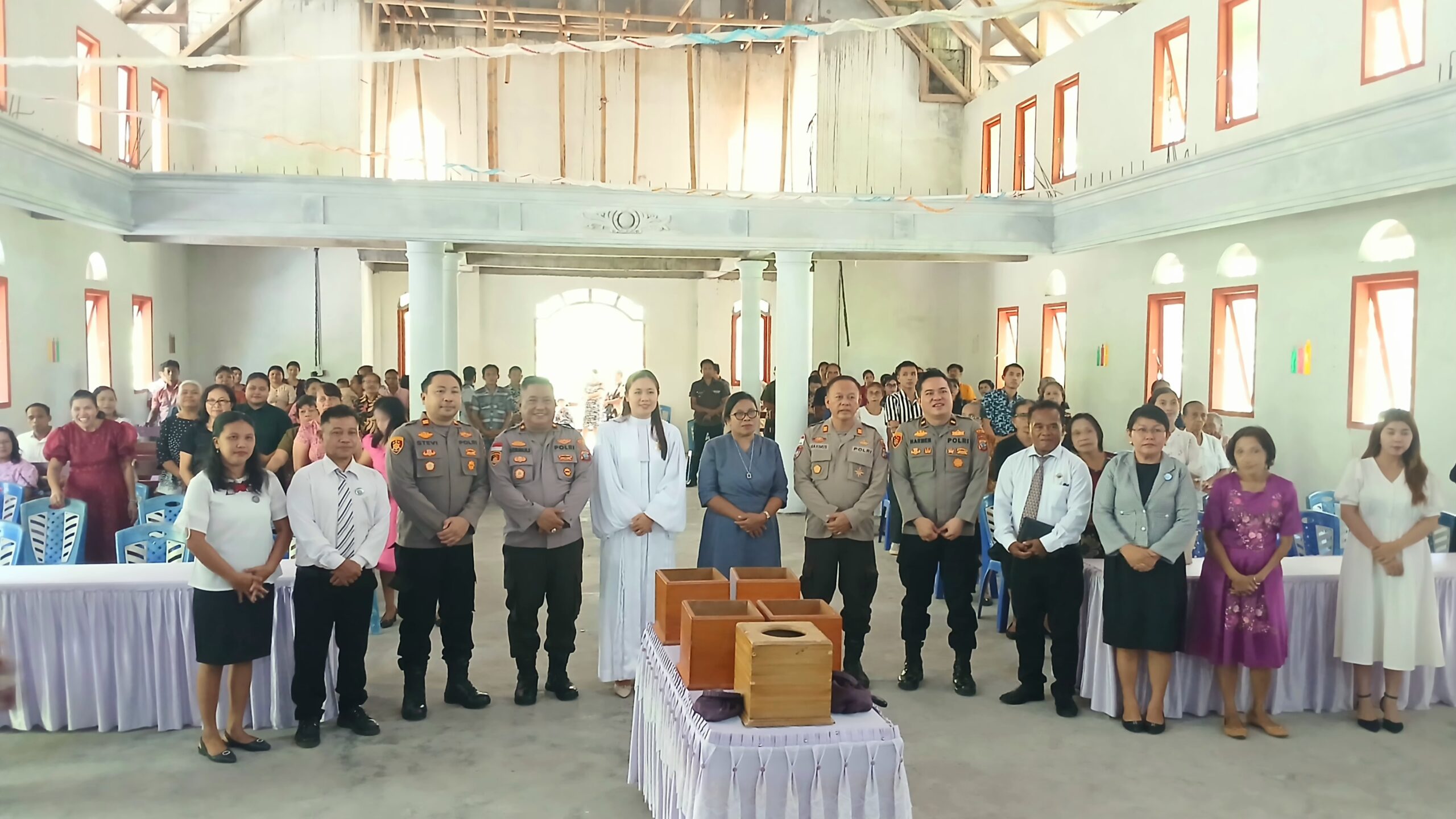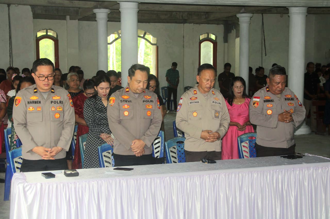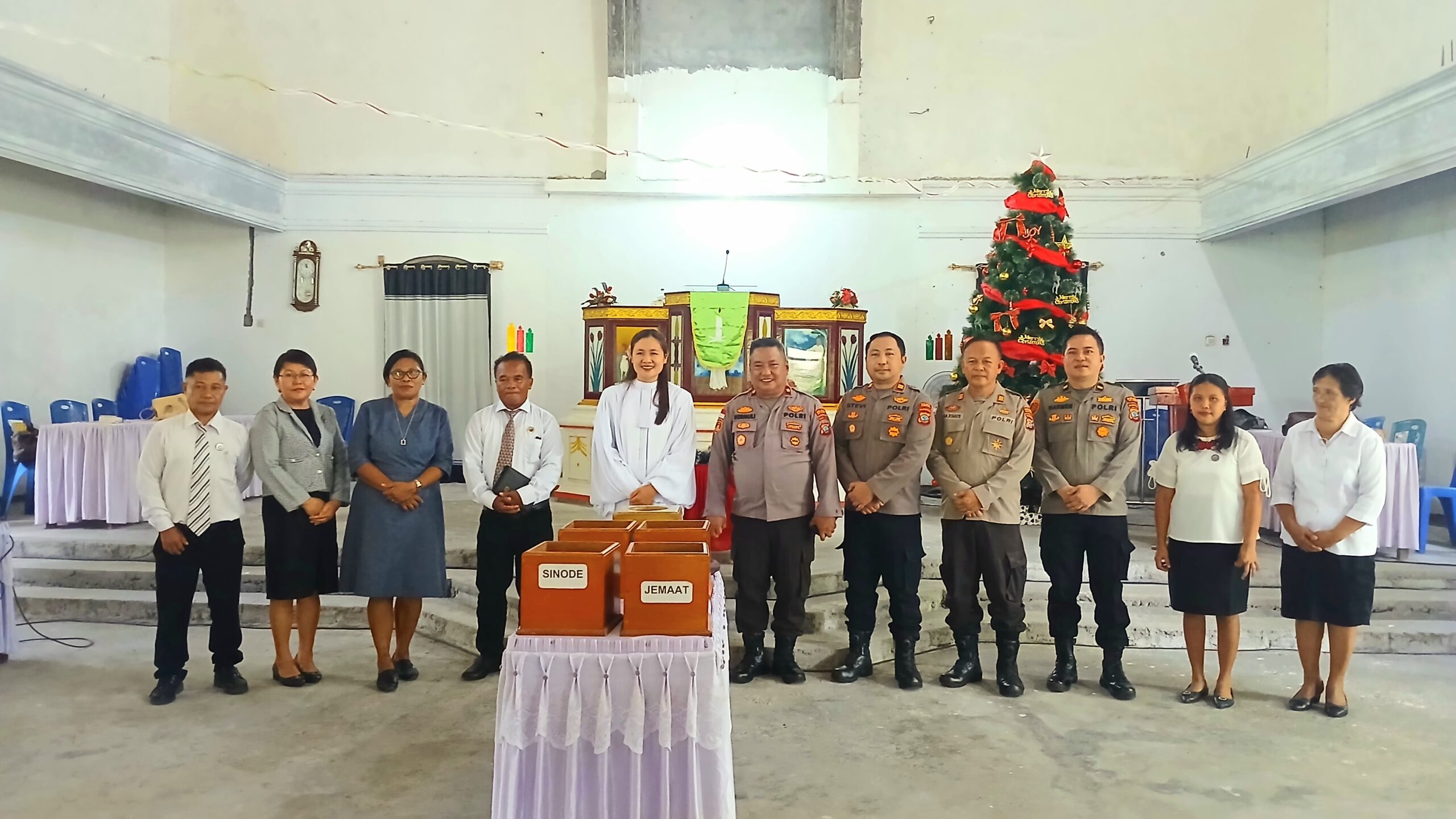 Kegiatan ibadah turut dihadiri Waka Polres Kepulauan Sangihe, Kompol Arivalianto Bermuli, SH., MH., bersama Kasat Binmas AKP Maximus Nouce Palandi, SE., Kasat Reskrim IPTU Stefi Sumolang, SH., MH., Kanit Tipikor IPDA Harmen Kontu, SH., MPJ., serta para jemaat.