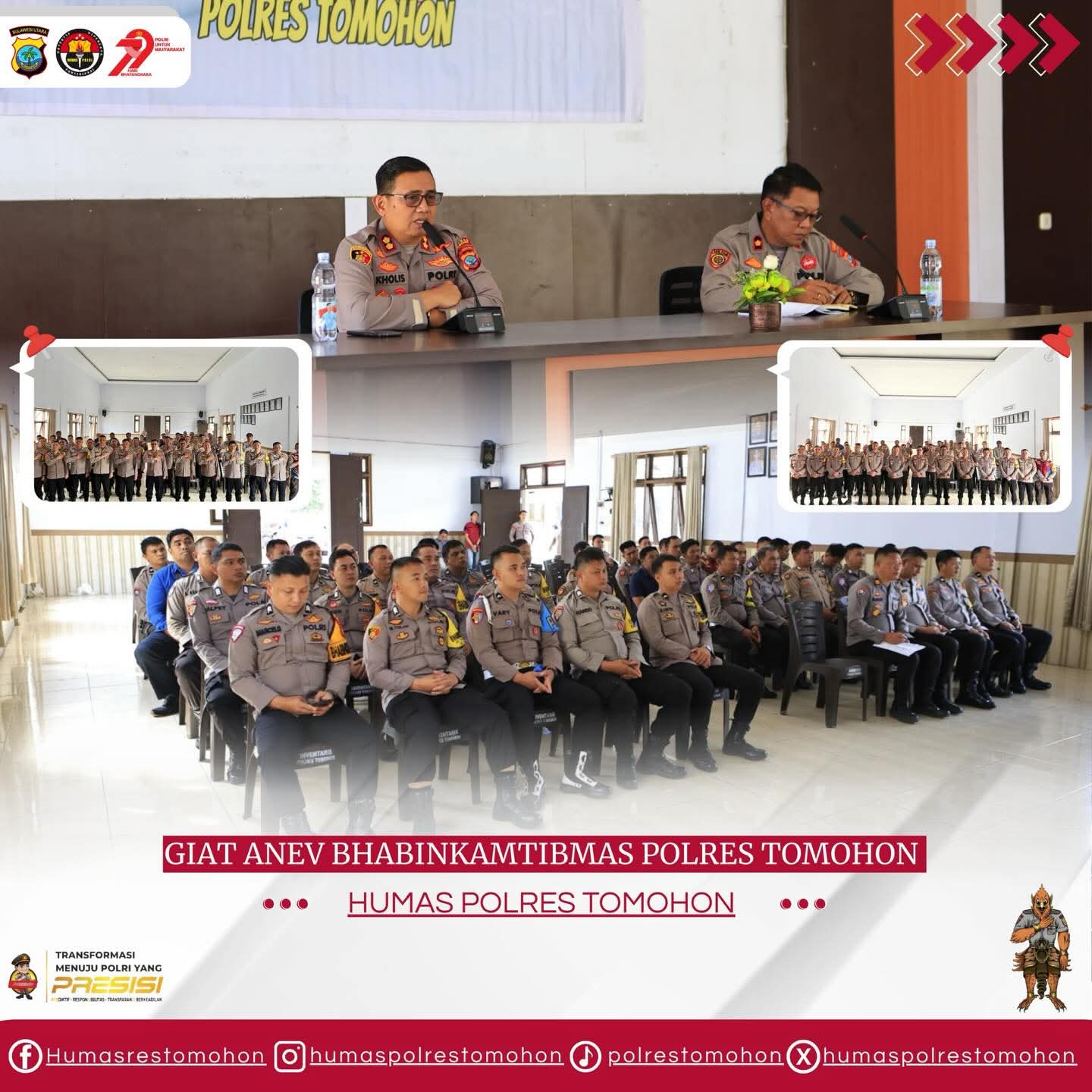 TOMOHON, Globalberita.com — Polres Tomohon menggelar kegiatan Analisa dan Evaluasi (Anev) Personil Bhabinkamtibmas di Aula Parama Satwika, Rabu (14/01/2026). Dalam forum tersebut, Kapolres Tomohon AKBP Nur Kholis, S.I.K., memberikan penekanan khusus mengenai peran vital Bhabinkamtibmas sebagai representasi Polri yang paling dekat dengan masyarakat.