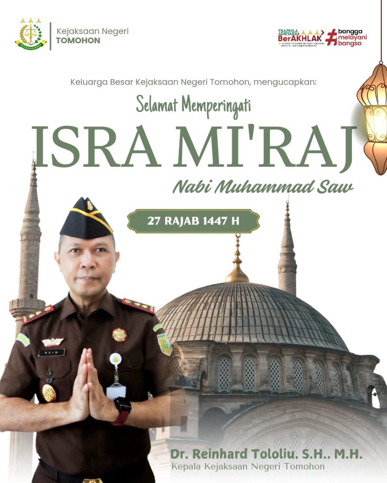 TOMOHON, Globalberita.com — Kepala Kejaksaan Negeri Tomohon, Dr. Reinhard Tololiu, S.H., M.H., bersama seluruh jajaran Kejaksaan Negeri Tomohon mengucapkan “Selamat Memperingati Isra Mi’raj Nabi Muhammad SAW” 27 Rajab 1447 H.