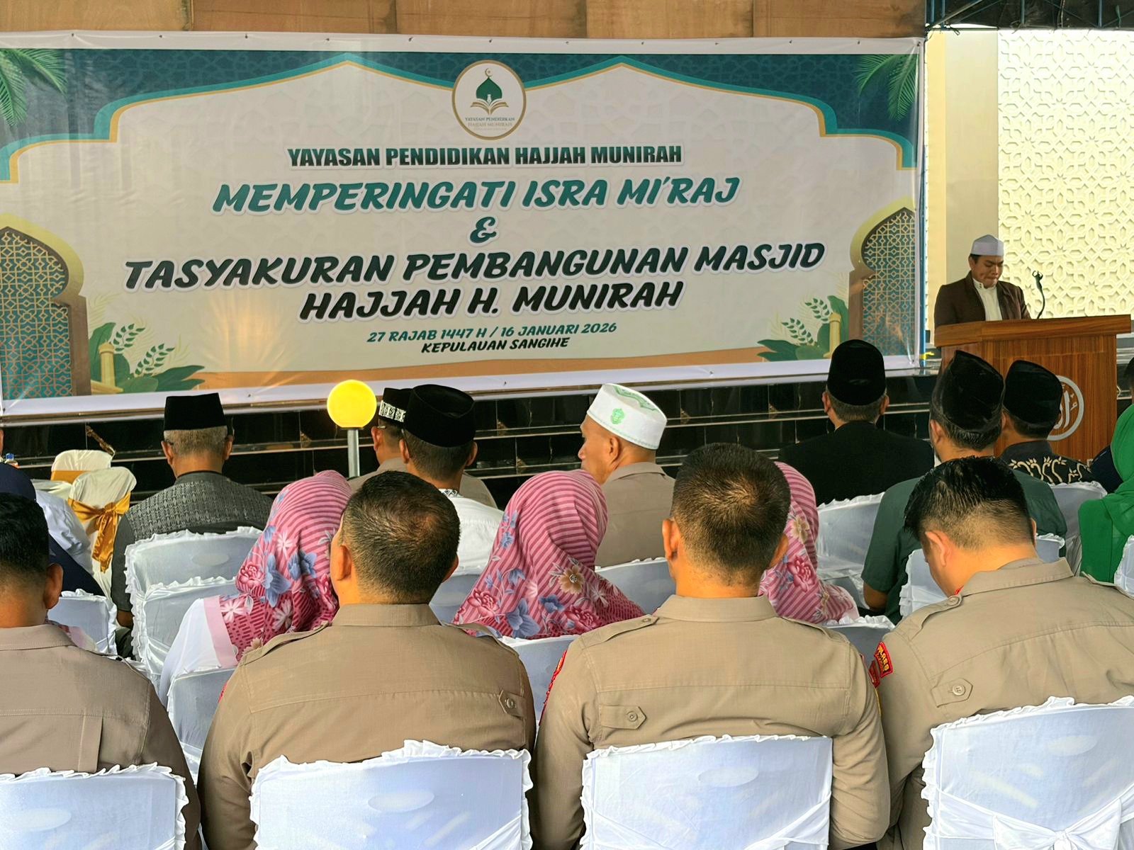 SANGIHE, GLOBALBERITA– Dalam memperingati Isra’ Mi’raj Nabi Muhammad SAW 1447 H Kapolres Kepulauan Sangihe AKBP Abdul Kholik, SH, SIK, MA menghadiri kegiatan peringatan Isra Miraj Nabi Muhammad SAW 1446 H dirangkaikan dengan Tasyukuran Pembangunan Masjid Hajjah Hasna Munirah, Jumat (16/1/2026).