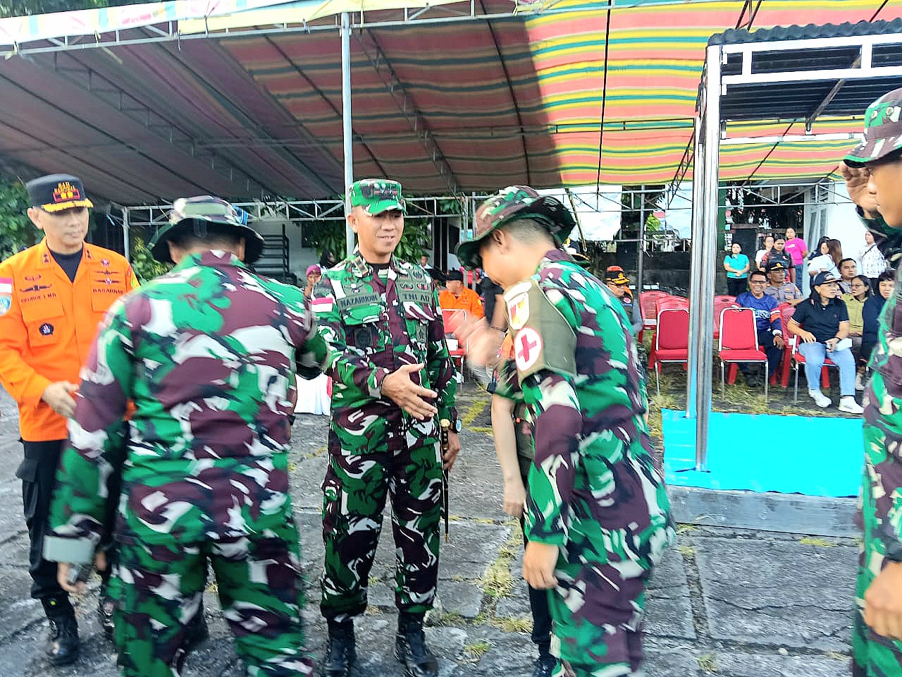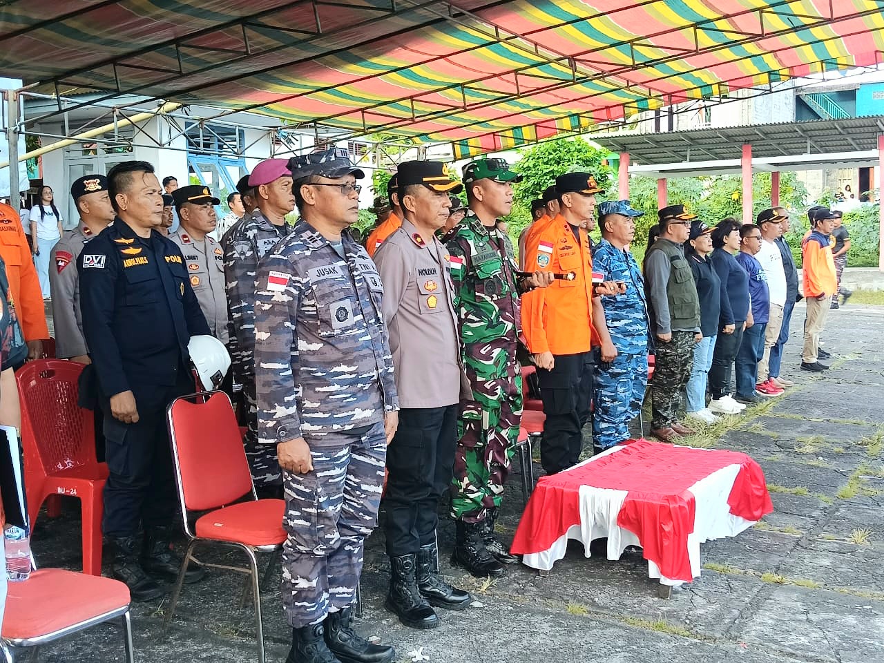 Turut hadir dalam kegiatan tersebut Dandim 1301/Sangihe Letkol Czi Nazarudin, S.T., M.I.P., perwakilan Lanudsri Letkol Kes Johny Gumansalangi, Kapolres Kepulauan Sitaro yang diwakili Kabag Ops Kompol Noldi Harimu, S.Pd, Kasi Ops Basarnas Provinsi Sulawesi Utara Ida Bagus Nyoman Ngura Asrama, Sekretaris Daerah Kepulauan Sitaro Drs. Denny Kondoj, M.Si, serta unsur TNI-AL, OPD, camat, lurah, dan kapitalau dari wilayah terdampak bencana.