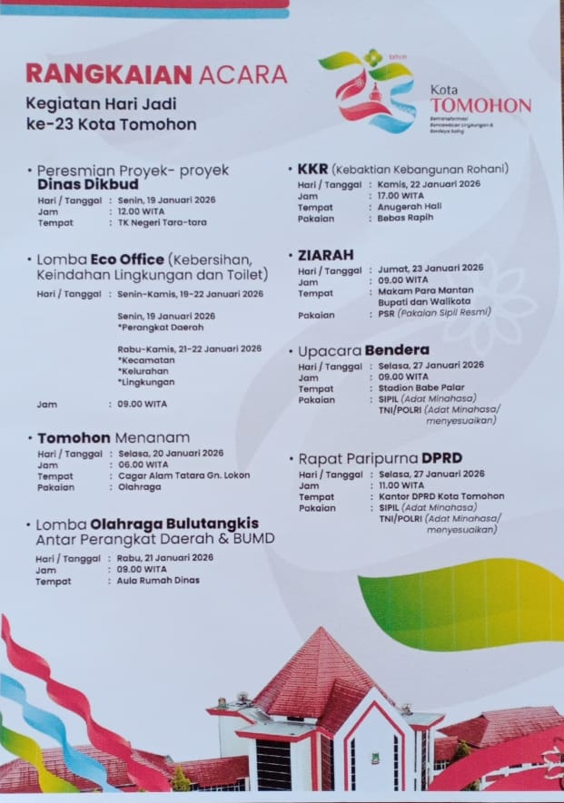 Sebagai puncak selebrasi, Stadion Babe Palar akan menjadi saksi kemegahan Upacara Bendera dengan nuansa adat Minahasa yang kental, sebelum akhirnya rangkaian seluruh kegiatan ditutup dengan khidmat dalam Rapat Paripurna di Kantor DPRD Kota Tomohon pada 27 Januari 2026.