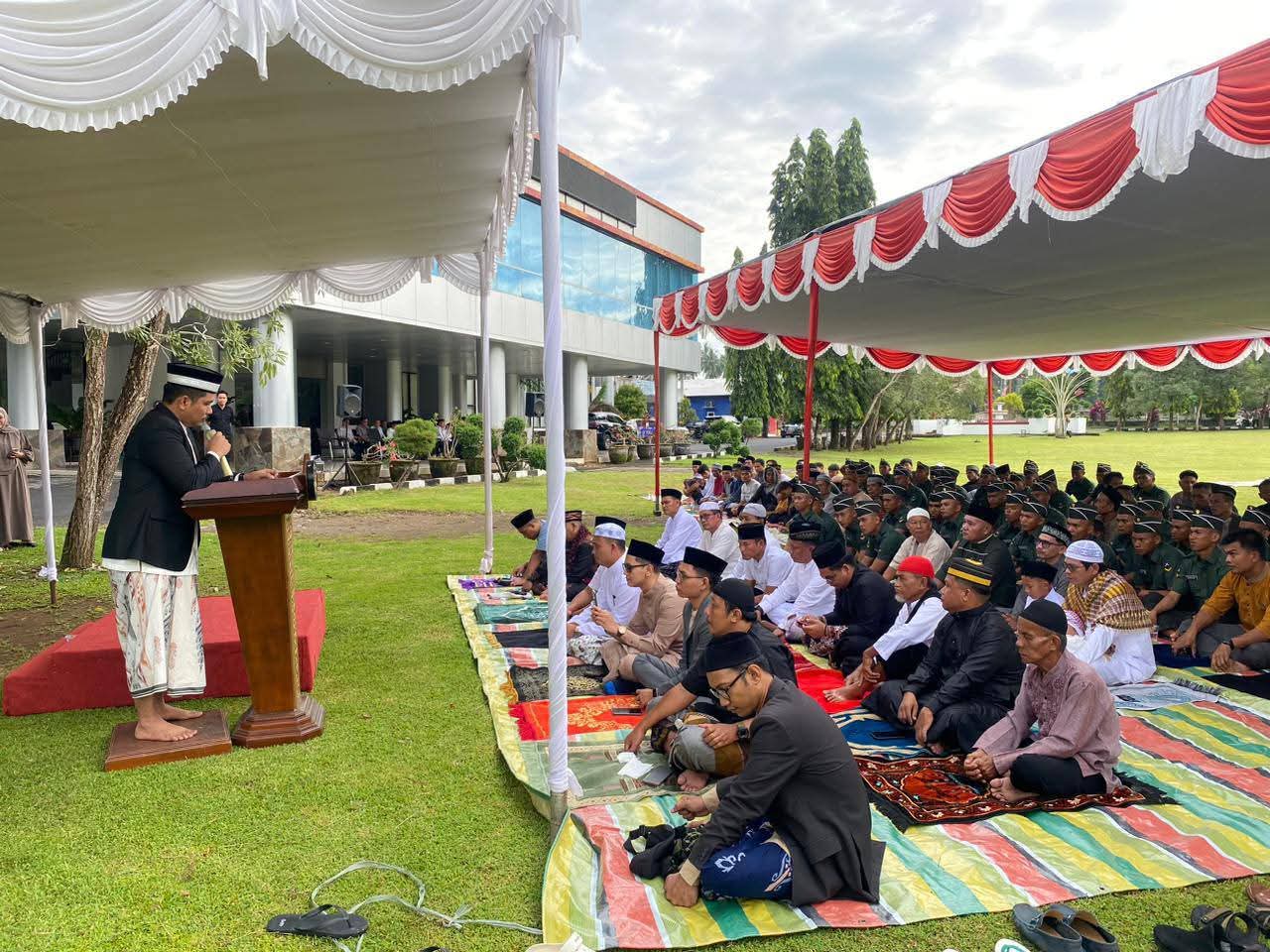 Bupati Minsel Franky Donny Wongkar, S.H., bersama Wakil Bupati Minahasa Selatan, Brigjen TNI (Purn.) Theodorus Kawatu, S.I.P., menghadiri pelaksanaan Sholat Idul Fitri 1447 Hijriah yang dilaksanakan di Halaman Kantor Bupati Minahasa Selatan, Sabtu (21/3).