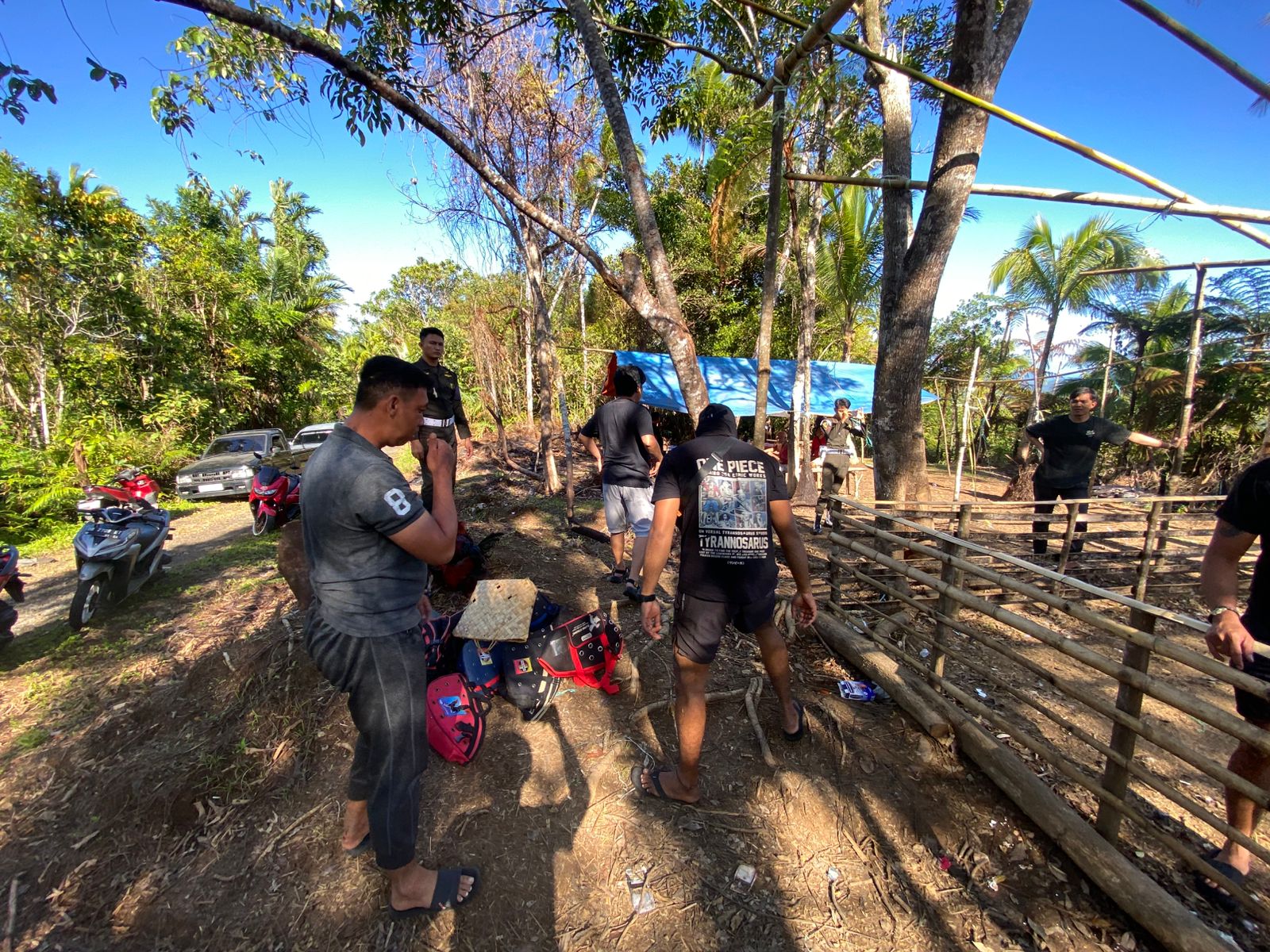 Dalam penggerebekan tersebut, petugas turut mengamankan sejumlah barang bukti, di antaranya tiga ekor ayam sabung dalam kondisi luka serta satu unit sepeda motor merek Mega Pro dengan nomor polisi DL 3257 AF.