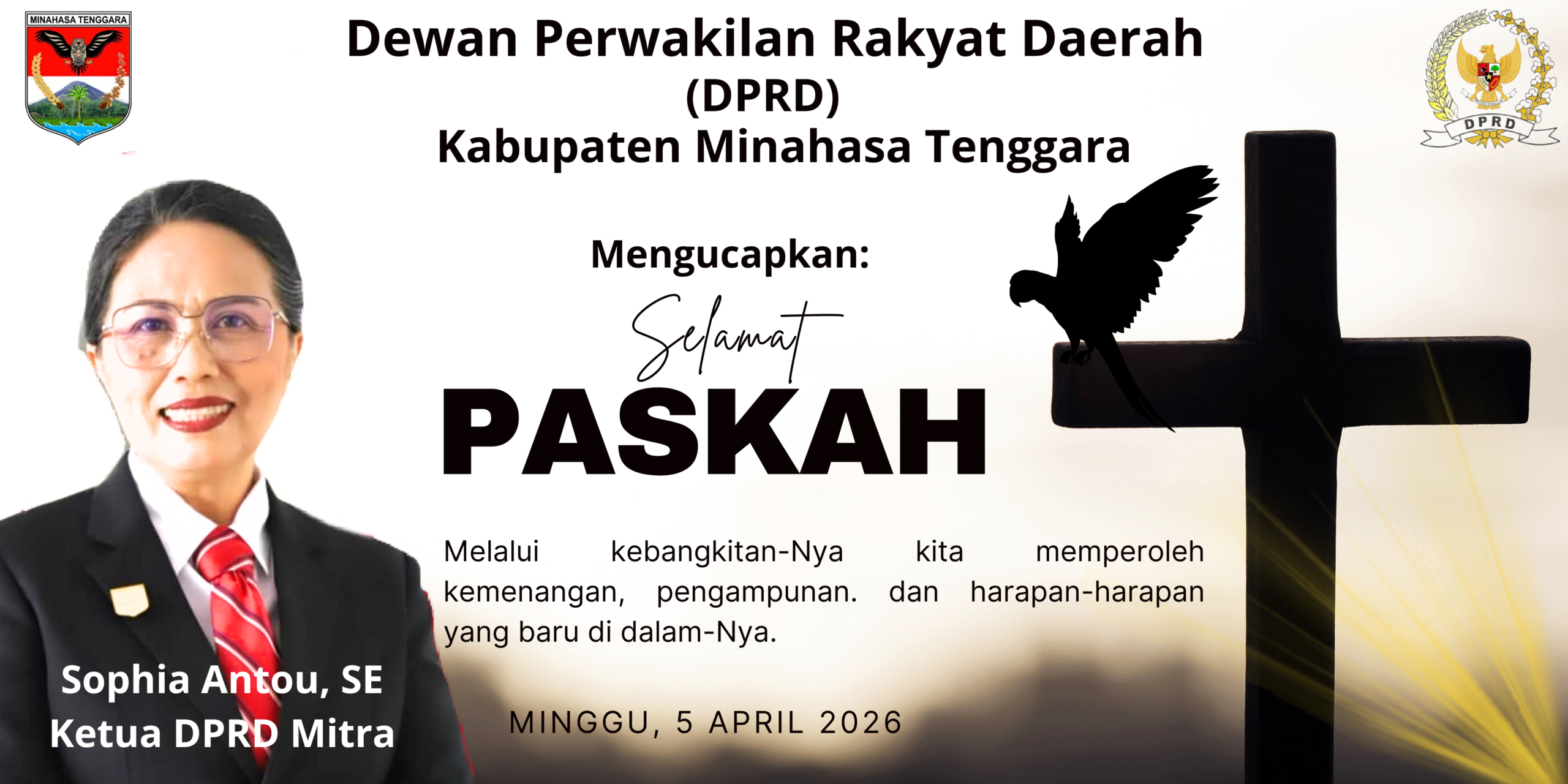 MITRA, Globalberita.com– Ketua Dewan Perwakilan Rakyat Daerah (DPRD) Kabupaten Minahasa Tenggara (Mitra) Sophia Antou, SE bersama seluruh anggota mengucapkan, Selamat Paskah Tahun 2026 kepada seluruh umat Kristiani yang ada di Kabupaten Mitra.