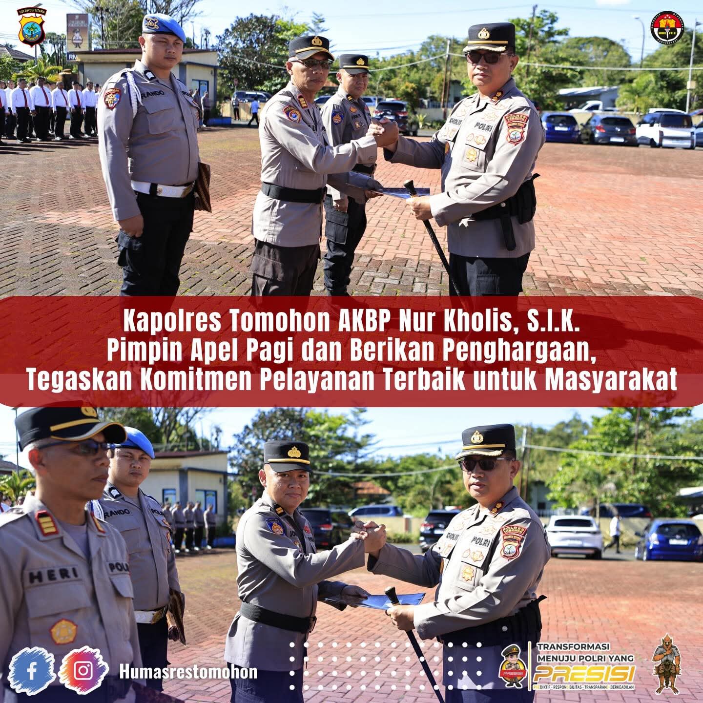 Kapolres Tomohon AKBP Nur Kholis dalam arahannya menegaskan bahwa prestasi yang diraih oleh kedua pejabat utama tersebut bukan sekadar keberhasilan administratif, melainkan sebuah integritas yang patut dicontoh oleh seluruh personel.