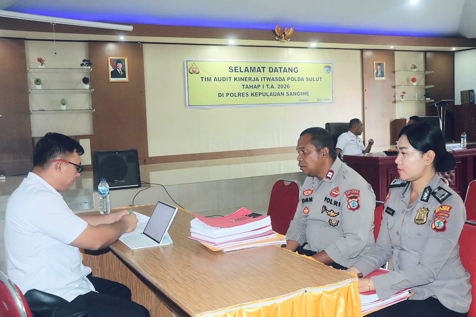 kegiatan audit resmi dimulai di Aula Sanika Satyawada Polres Kepulauan Sangihe. Kegiatan tersebut dibuka dengan sambutan Kapolres AKBP Abdul Kholik, dilanjutkan arahan dari Pengawas Tim I Kombes Pol C. Bambang Harlyanto.