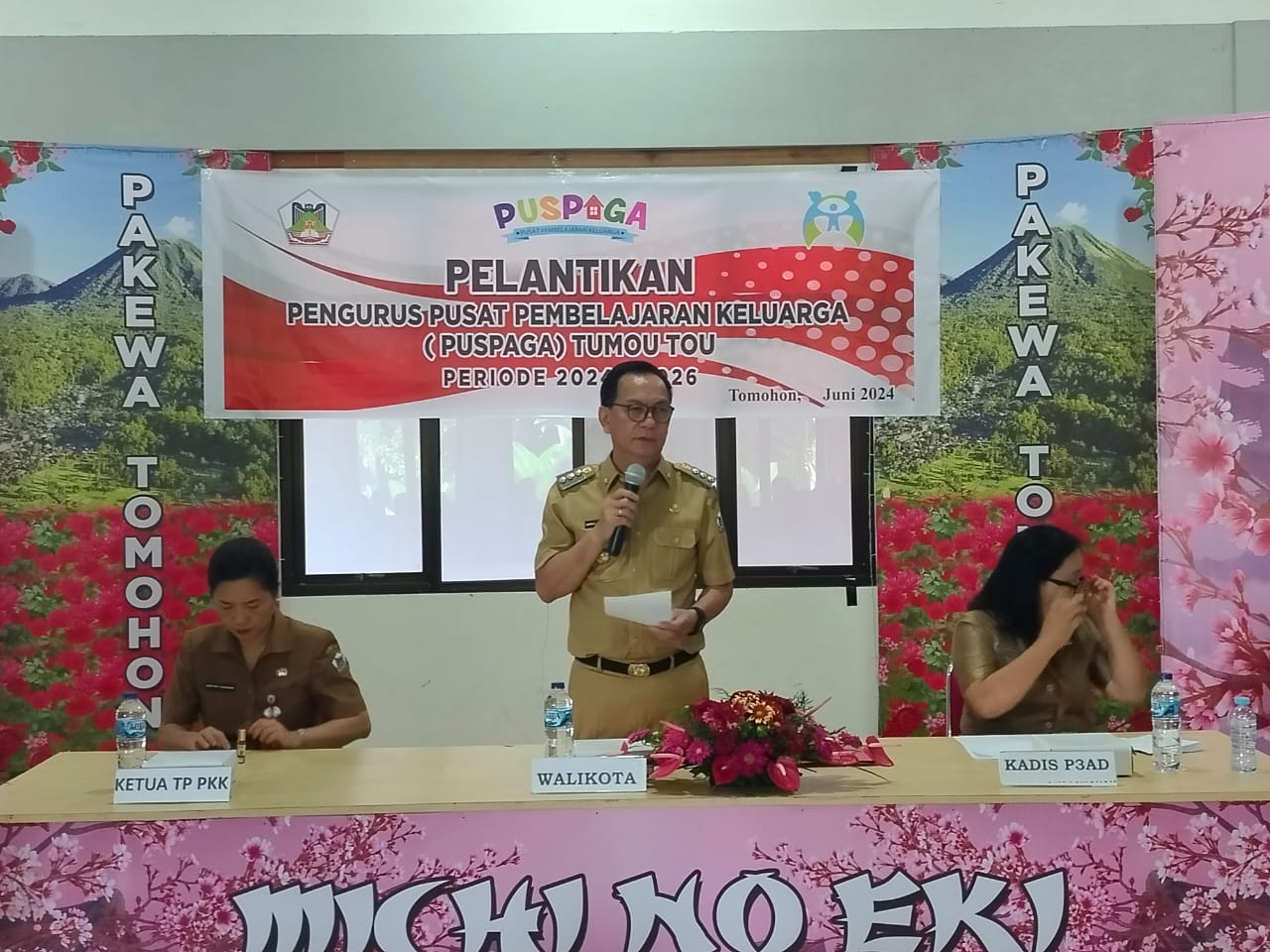 TOMOHON, GLOBAL BERITA — Walikota Tomohon Caroll J A Senduk SH bersama Ketua TP-PKK Kota Tomohon drg.Jeand’arc Senduk-Karundeng menghadiri Pelantikan Pengurus Pusat Pembelajaran Keluarga (PUSPAGA) Tumou Tou periode 2024-2026, Bertempat di Michi No Eki Pakewa. Selasa,(11/6/2024).