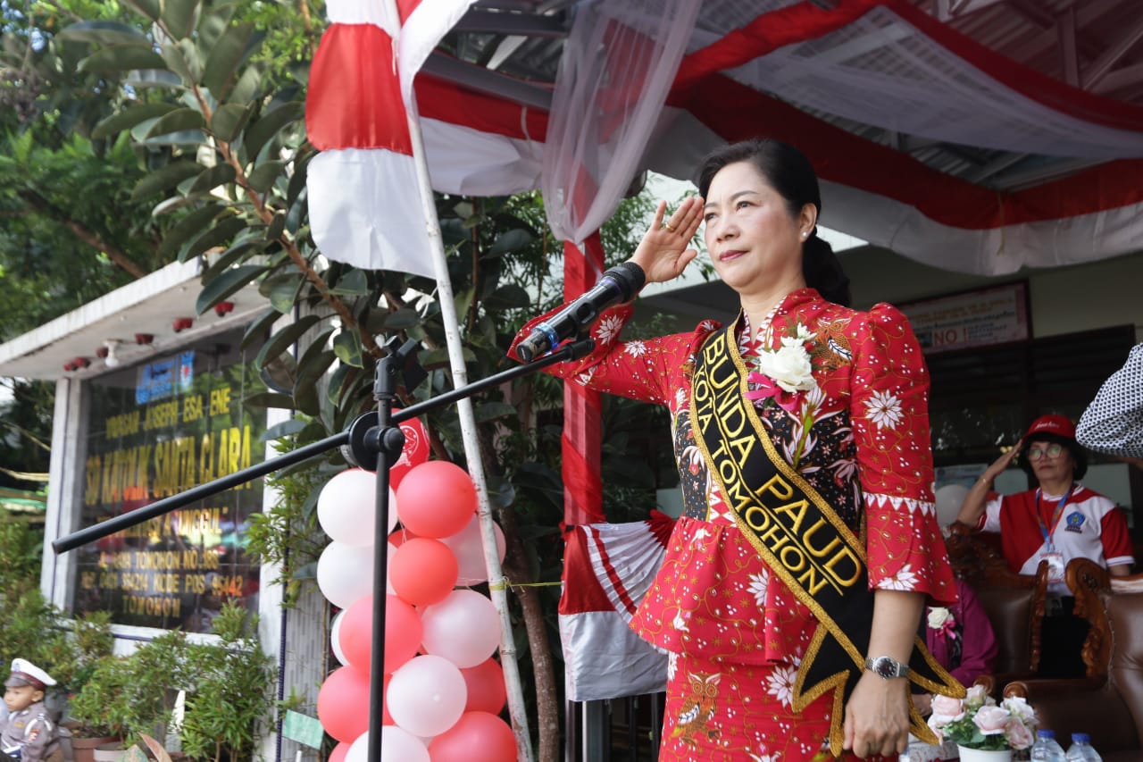 TOMOHON, GLOBAL BERITA — Bunda Paud Kota Tomohon Drg. Jeand’arc Senduk Karundeng selaku ketua TP PKK Kota Tomohon menghadiri Pawai Bocah TK dan SD dalam rangka memperingati hari Kemerdekaan Republik Indonesia ke – 79. Dimulai dengan Perarakan yang bertempat di Lingkungan SD St. Clara menuju Panggung Utama samping menara Alfa Omega Kota Tomohon . Kamis, (15/8/2024).