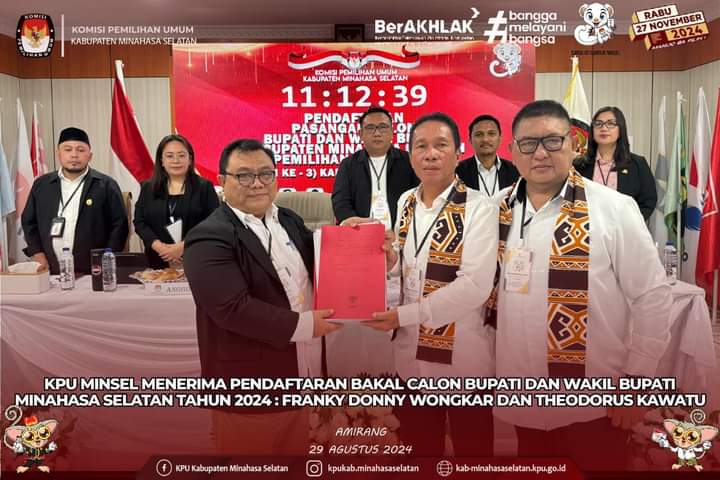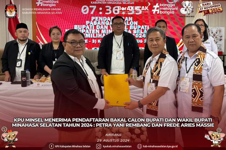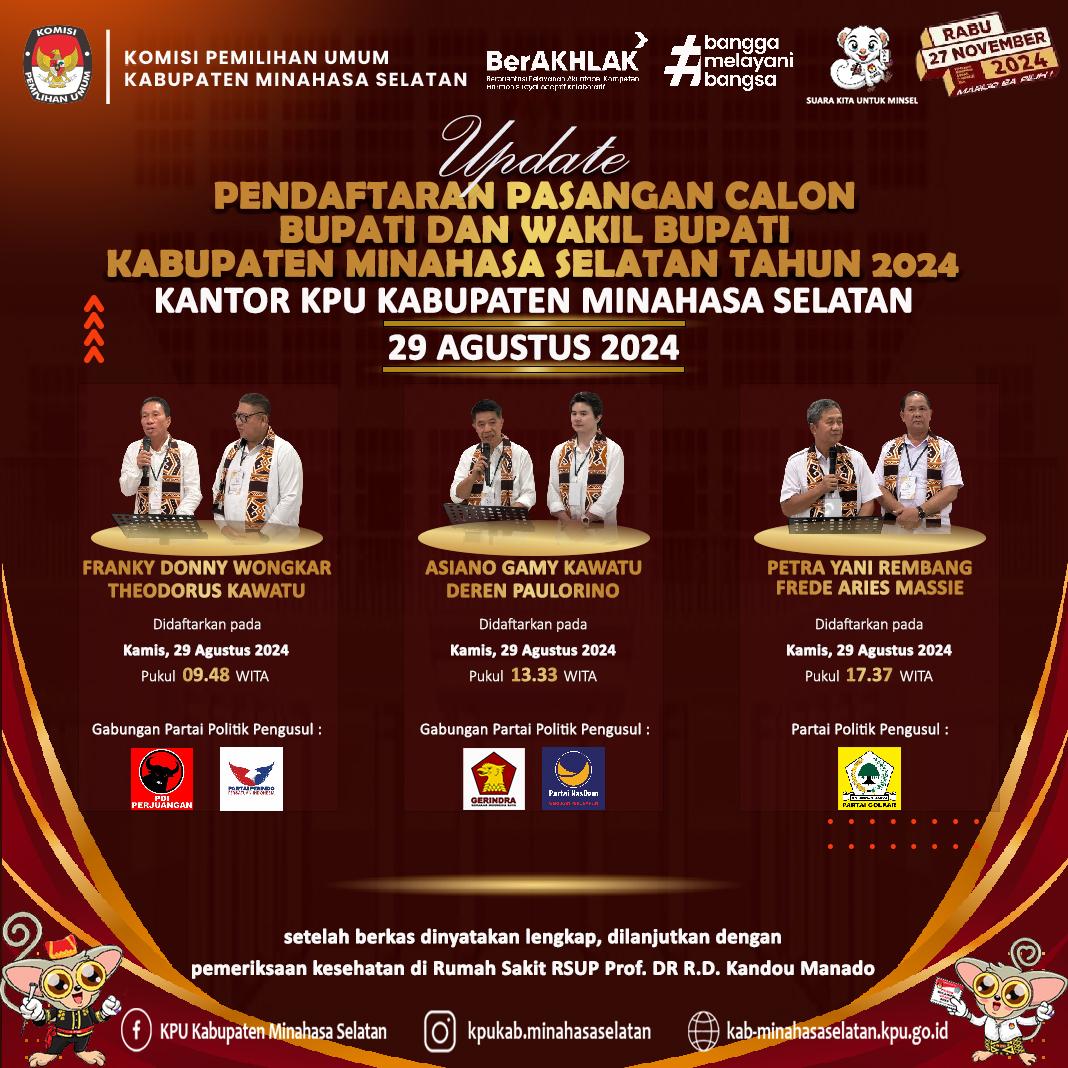 Hal itu dipastikan setelah tahapan pendaftaran pasangan calon ditutup oleh Komisi Pemilihan Umum (KPU) Minsel, Kamis (29/8) terdapat tiga kandidat calon Bupati dan Wakil Bupati yang mendaftar.