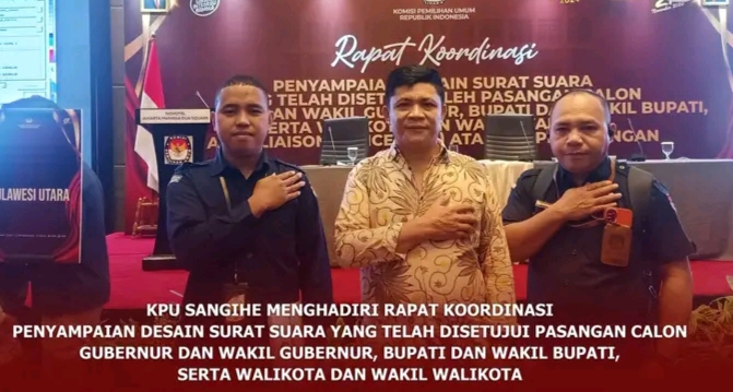 SANGIHE, GLOBALBERITA– KPU Sangihe menghadiri Rapat Koordinasi Penyampaian Desain Surat Suara Untuk Pemilihan Gubernur dan Wakil Gubernur, Bupati dan Wakil Bupati, serta Walikota Dan Wakil Walikota Tahun 2024. Selasa s.d. Kamis (1-3/10/2024).
