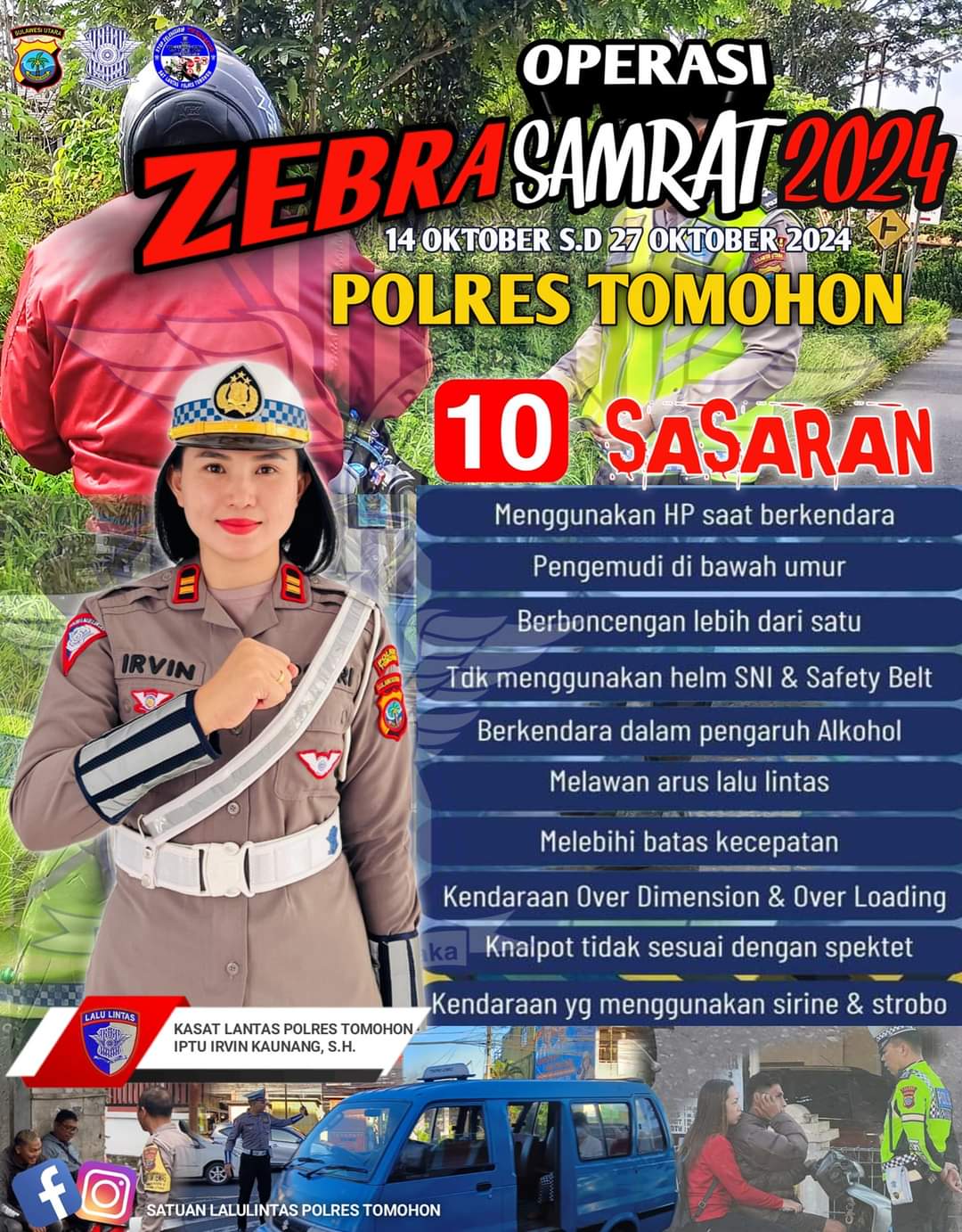 Kasat Lantas Polres Tomohon, Iptu Irvin Kaunang SH mengatakan, 10 sasaran pada operasi Zebra Samrat 2024 ini yakni bagi pengendara yang menggunakan HP saat berkendara,Pengemudi di bawah umur, Berboncengan lebih dari satu,Tidak menggunakan helm SNI dan Safety Belt, Berkendara dalam pengaruh Alkohol, Melawan arus lalu lintas,Melebihi batas kecepatan, Kendaraan Over Dimension dan Over Loading, Knalpot tidak sesuai atau tidak standar dan Kendaraan yang menggunakan sirine dan strobo.