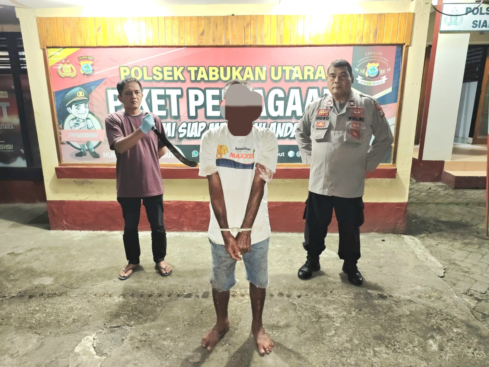 Polsek Tabukan Utara yang menerima laporan dari masyarakat langsung bertindak cepat. Kanit Reskrim Aiptu Janus Sumangando, S.H., bersama KA SPK Aiptu Indro Hermanto dan anggota jaga segera menuju lokasi dan melakukan pencarian terhadap pelaku. Dalam waktu singkat, pelaku berhasil diamankan di dekat lokasi kejadian tanpa perlawanan, beserta barang bukti berupa sebilah parang.