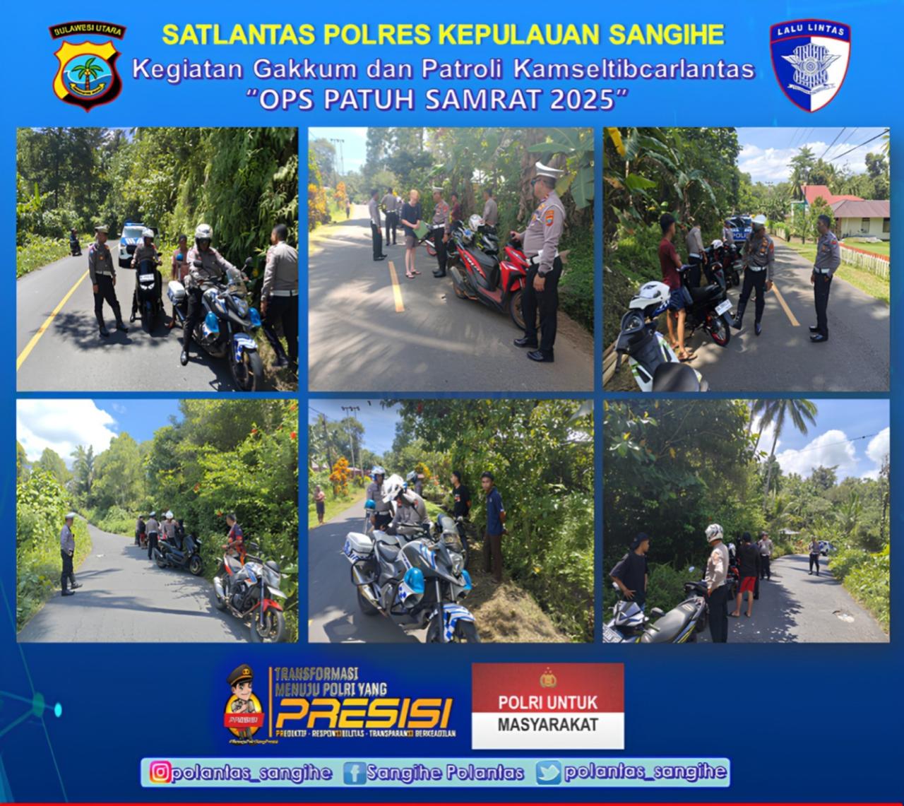 Patroli kamseltibcarlantas kali ini menyisir wilayah kecamatan manganitu dan kecamatan tabukan tengah, dipimpin oleh Kasat Lantas IPTU Ismail Diko, S.Sos beserta Personel unit Turjawali Satlantas Polres Kepulauan Sangihe, dengan sasaran para pengemudi kendaraan bermotor yang menggunakan ponsel saat berkendara, pengemudi di bawah umur, ranmor yang menggunakan knalpot brong, berboncengan lebih dari satu dan juga tidak menggunakan helm SNI untuk sepeda motor dan penggunaan safety belt untuk kendaraan roda empat, juga mengawasi para pengemudi yang dalam pengaruh alkohol, melawan arus serta melebihi kecepatan dan over dimensi over loading. Ini berpotensi menyebabkan adanya dampak, sehingga harus ditertibkan.