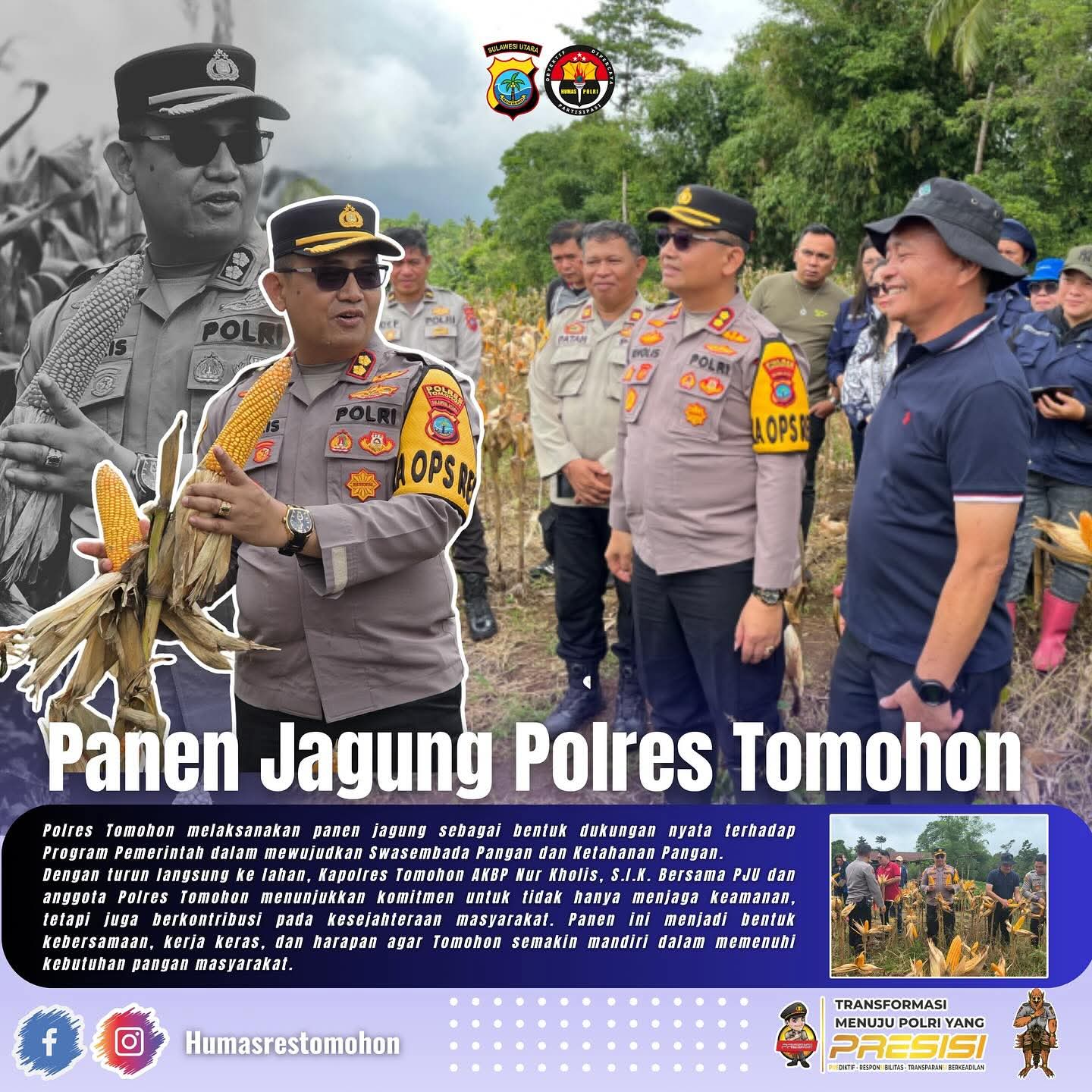 “Panen jagung ini adalah bentuk kebersamaan dan kerja keras kami. Kami berharap, dengan kegiatan ini, Tomohon dapat semakin mandiri dalam memenuhi kebutuhan pangan masyarakat,” ujar AKBP Nur Kholis, S.I.K.