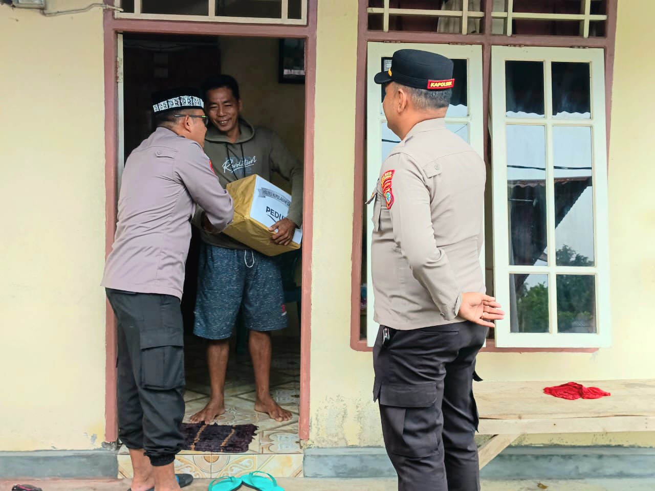 setelah dilakukan jumat Curhat di lanjutkan dengan penyerahan bantuan berupa sembakok yang di serahkan oleh Kapolres Kepulauan Sangihe kepada jamaah masjid At-Taqwa, sebanyak lima orang penerima bantuan.