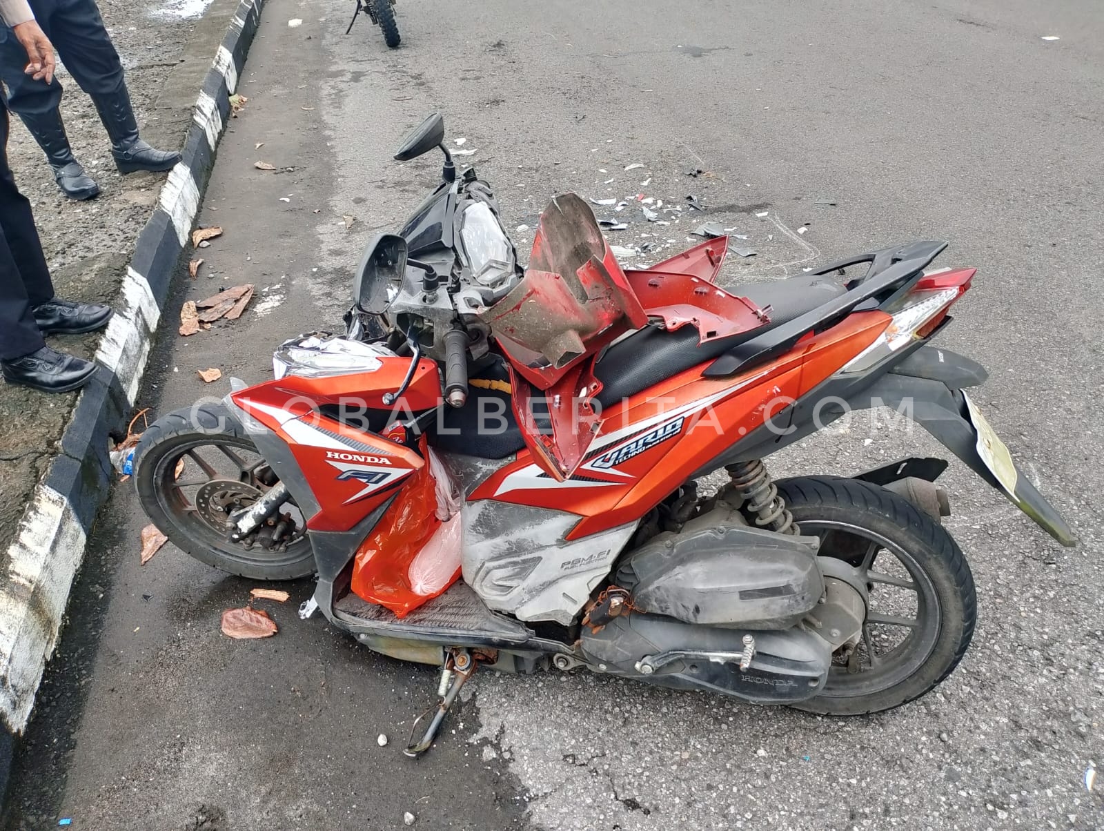Kecelakaan lalu lintas Tabrakan depan belakang antara Ranmor R2 dengan Ranmor R4 (Parkir), melibatkan Sepeda motor merk Honda Vario warna merah nomor polisi DL 3004 A (Kendaraan Plat merah) dan Mobil Pick up merk Toyota Kijang warna hitam nomor polisi DL 8474 QA.