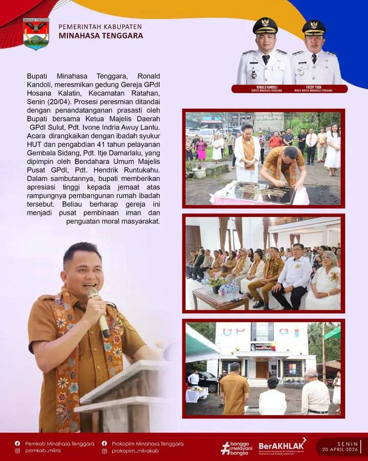 MITRA, Globalberita.com– Bupati Kabupaten Minahasa Tenggara (Mitra) Ronald Kandoli menghadiri Andah peresmian gedung Gereja GPdI Hosana Kalatin, Kecamatan Ratahan. Bertempat di gedung Gereja GPDI Hosana Kalatin, Senin 20 April 2026.